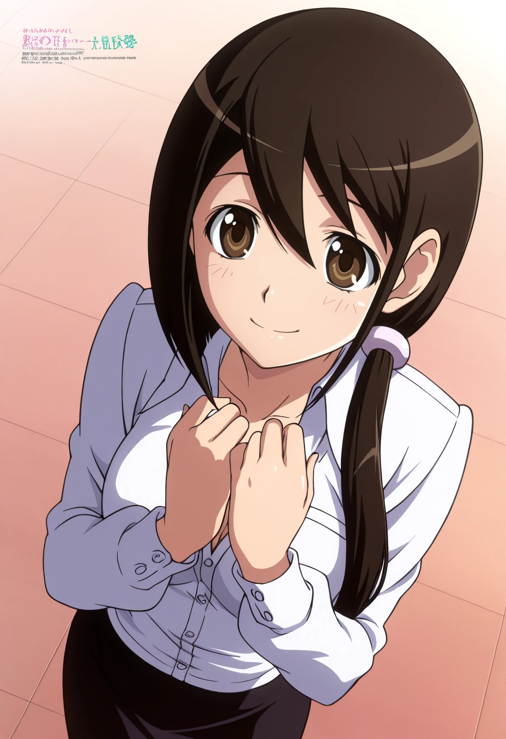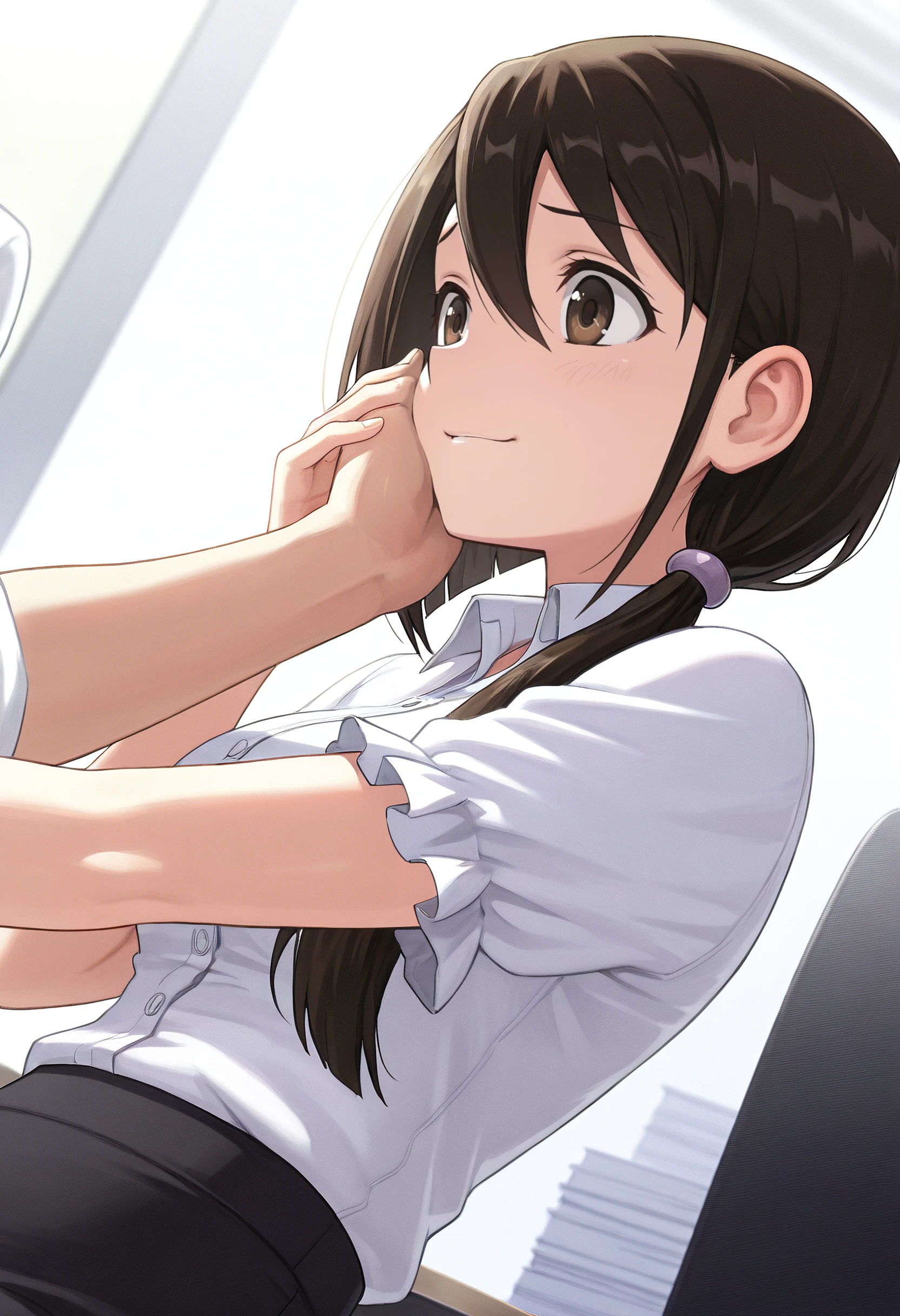 JunSchool, shirt, dress shirt, white shirt, long sleeves, collared shirt, scrunchie, teacher, skirt, pencil skirt, hair ornament, black skirt, open shirt, hair scrunchie,