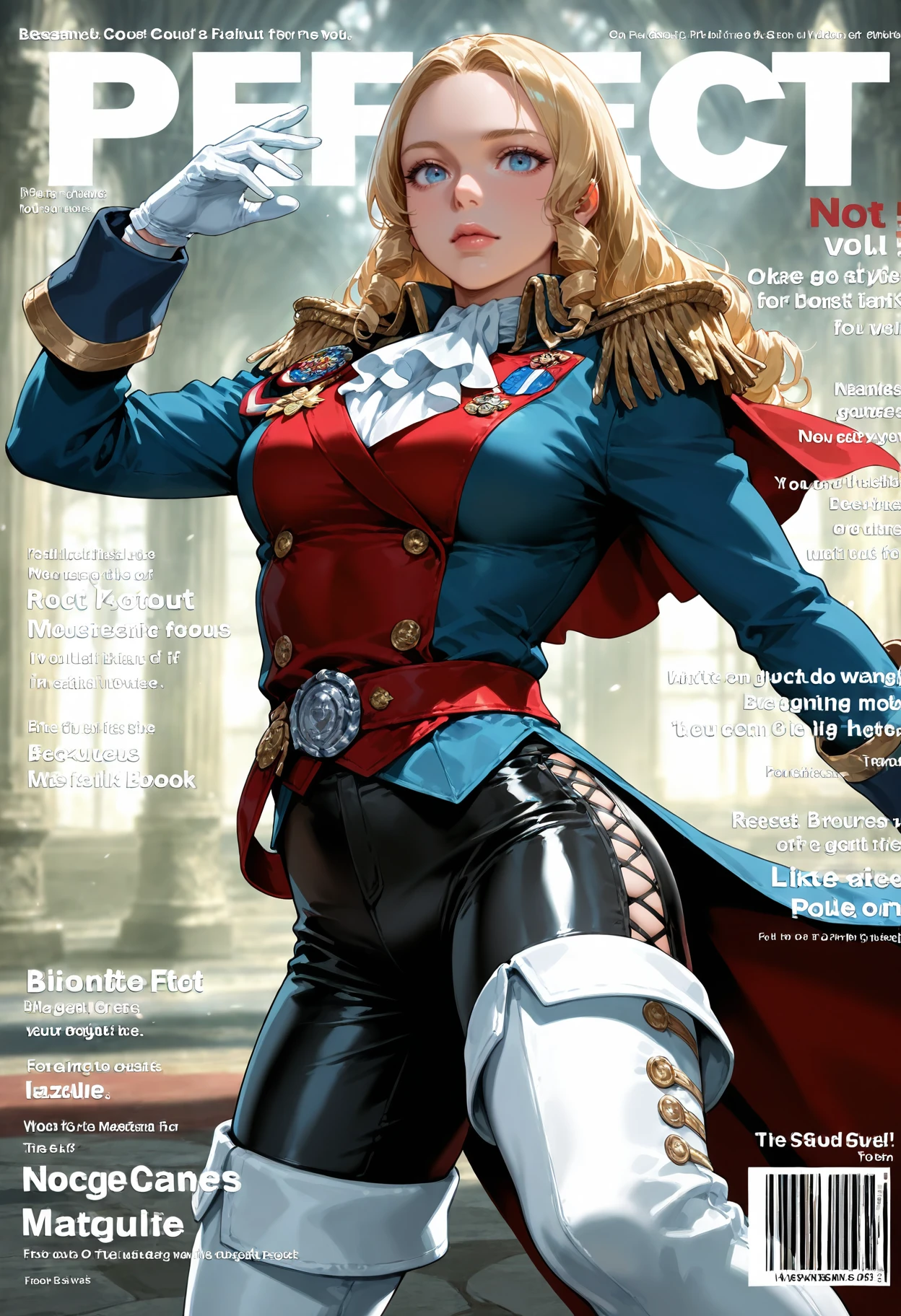 short hair,bow,medal,ascot,gloves,white gloves,epaulettes,uniform,breasts,medium breasts,pants,thighhighs,boots,thigh boots,white footwear