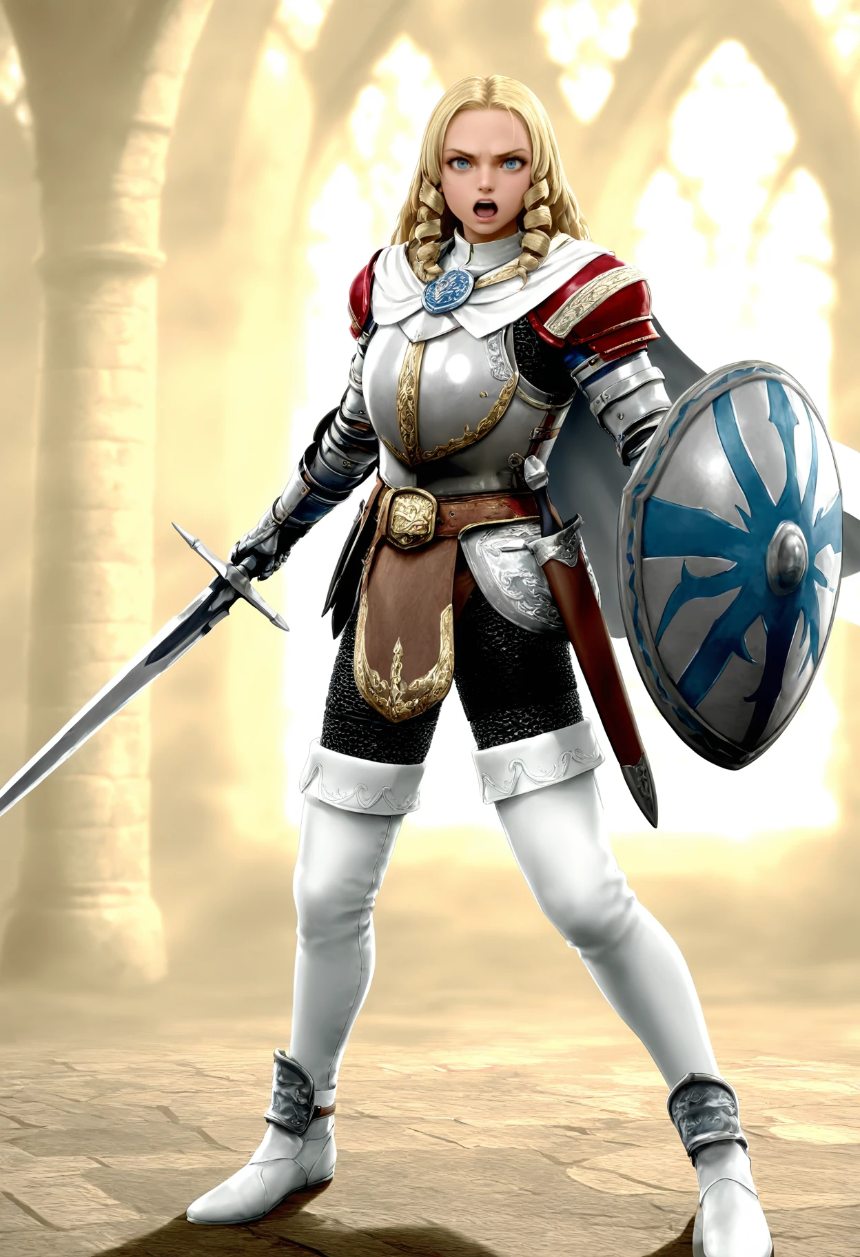 armor,breastplate,cape,gauntlets,gloves,shoulder armor,pauldrons,chainmail,belt,thighhighs,boots,thigh boots,white footwear