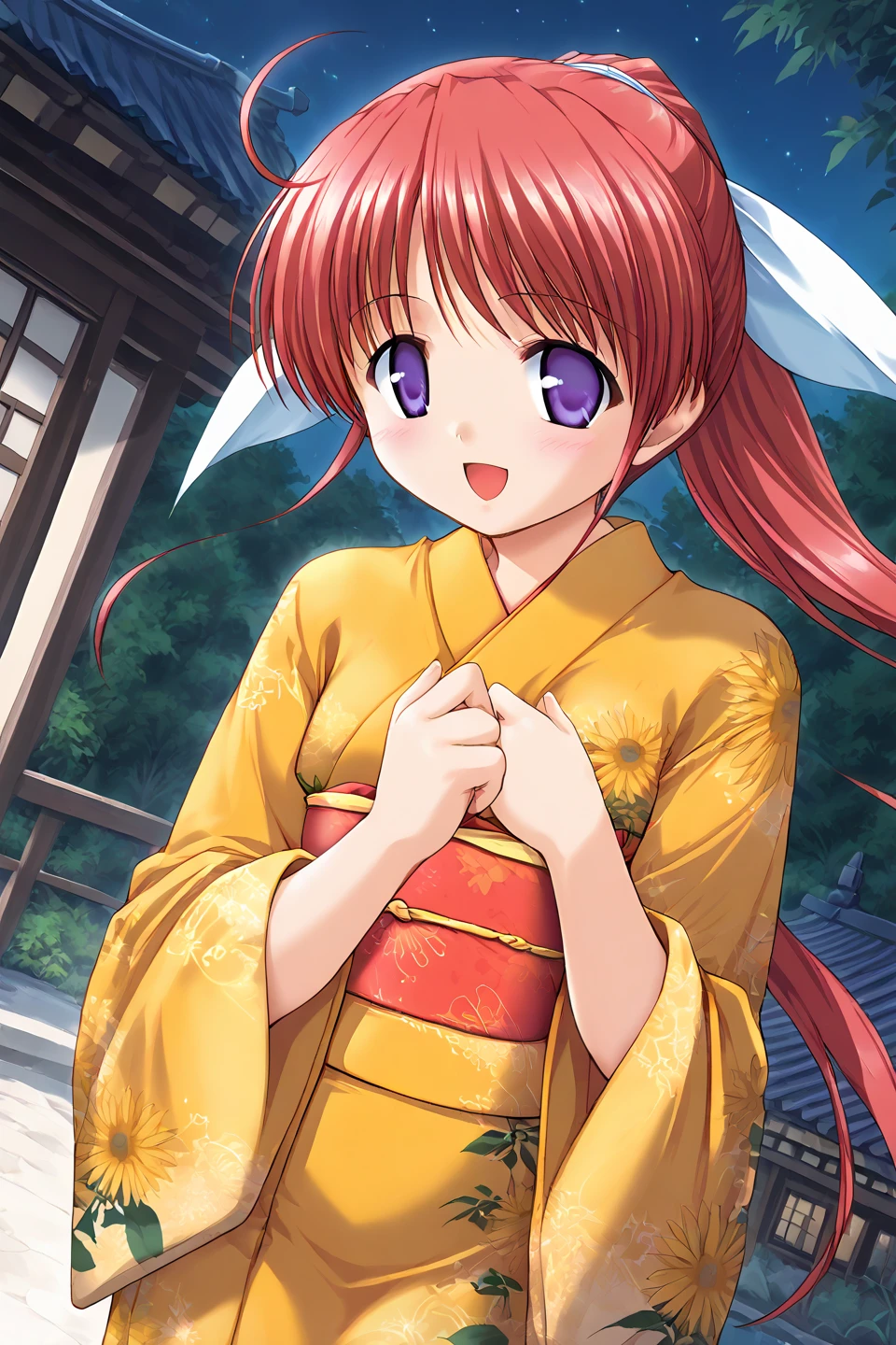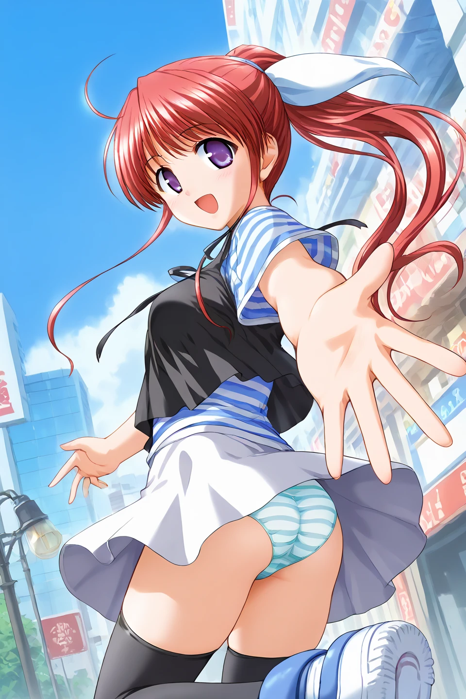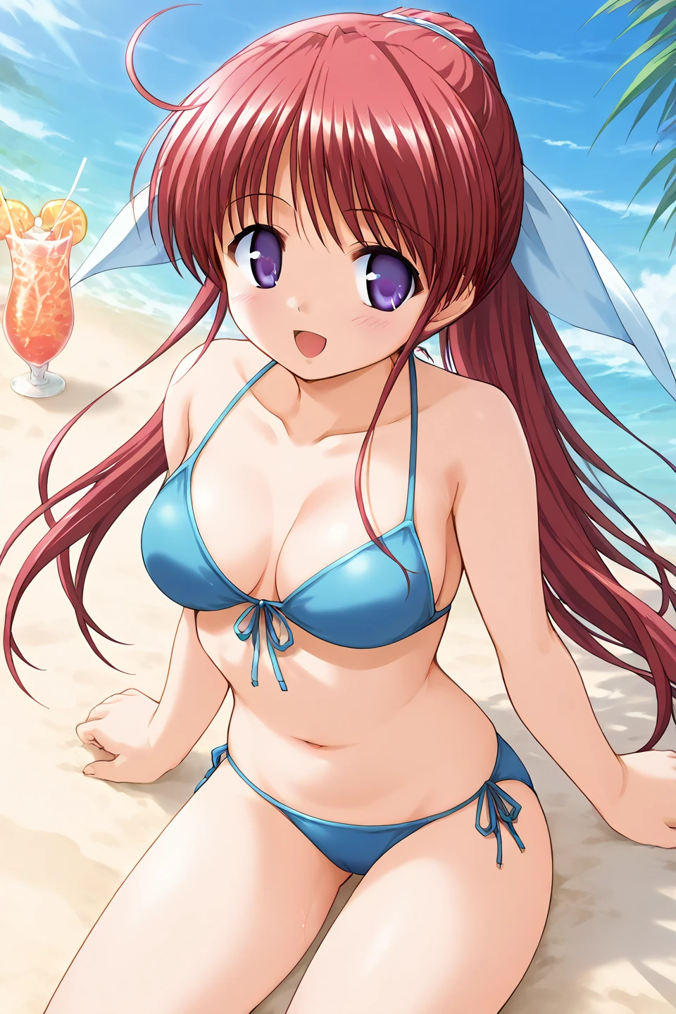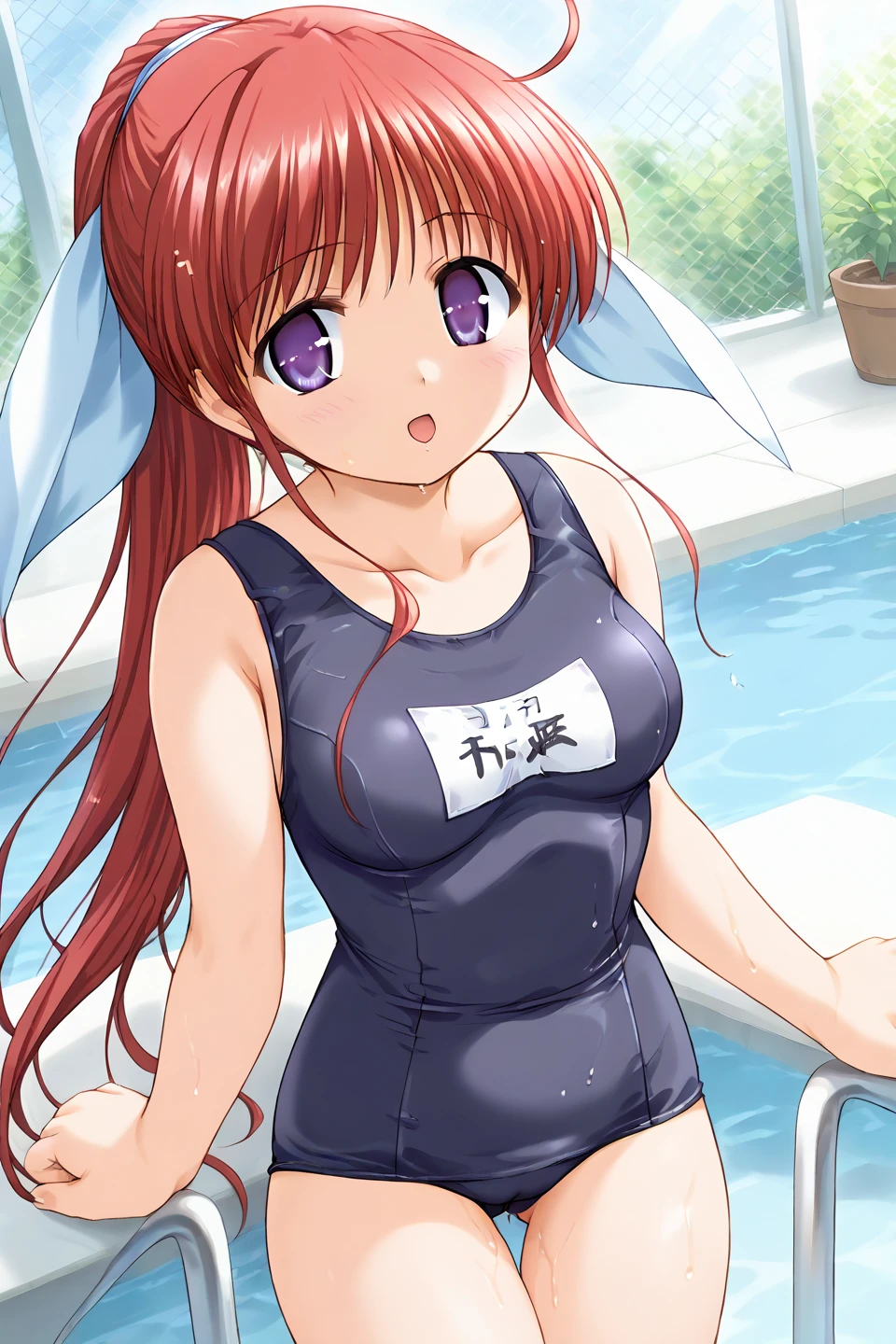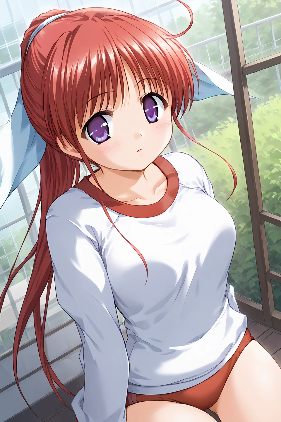 amagasaki mikoto,purple eyes,red hair,ponytail,very long hair,ahoge,ribbon,hair ribbon,