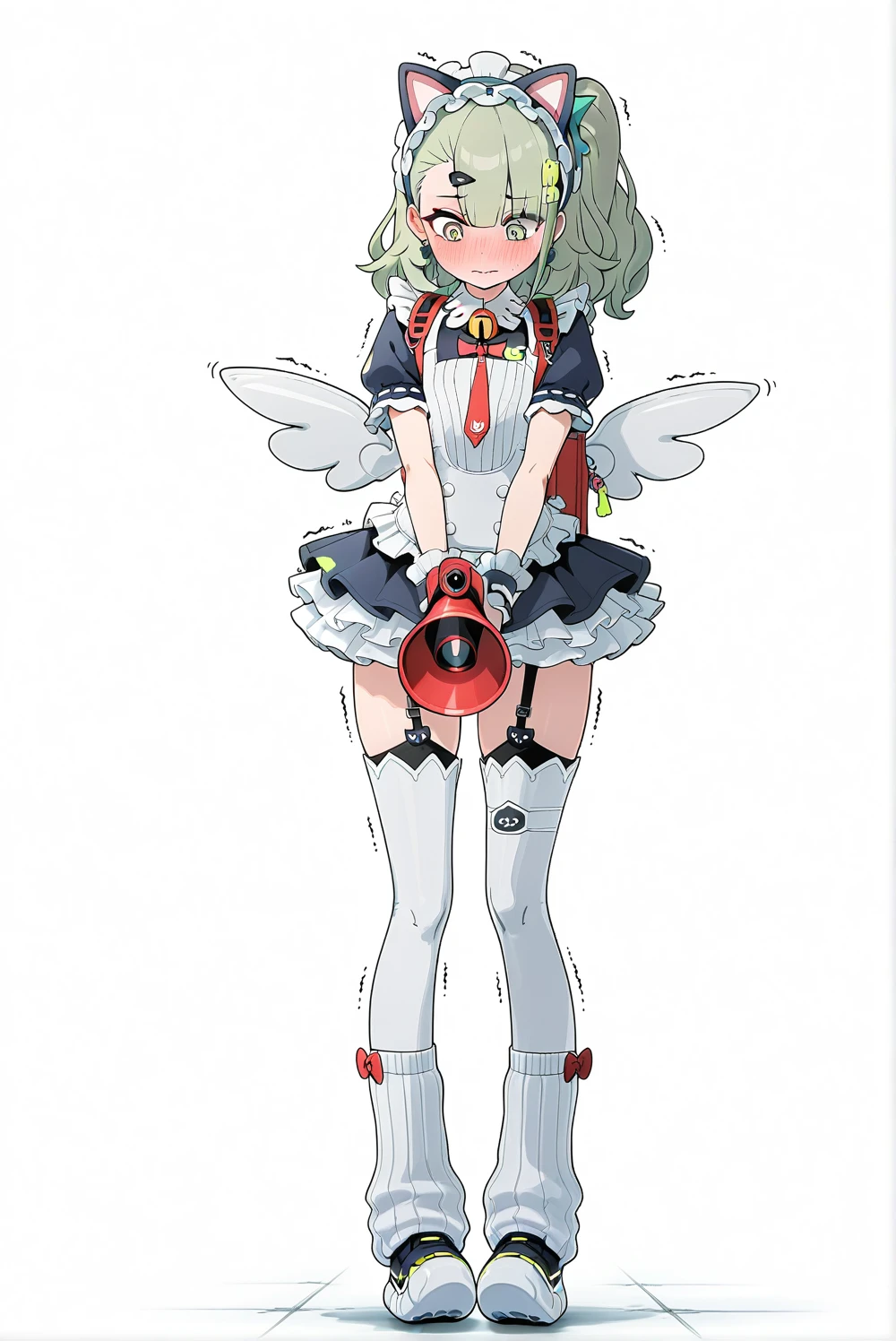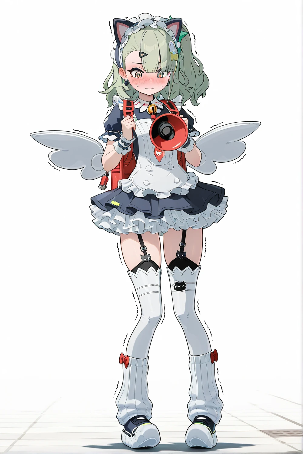 外貌和服饰:megaphone, bell, black earrings, cat ear hairband, chunky sneakers, frilled sleeves, garter belt, golden eyes, green hair, green hair scrunchie, hair ornament, hairclip, katyusha, loose socks, maid, red backpack, red necktie, side ponytail, white thighhighs, white wings,