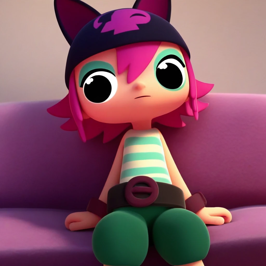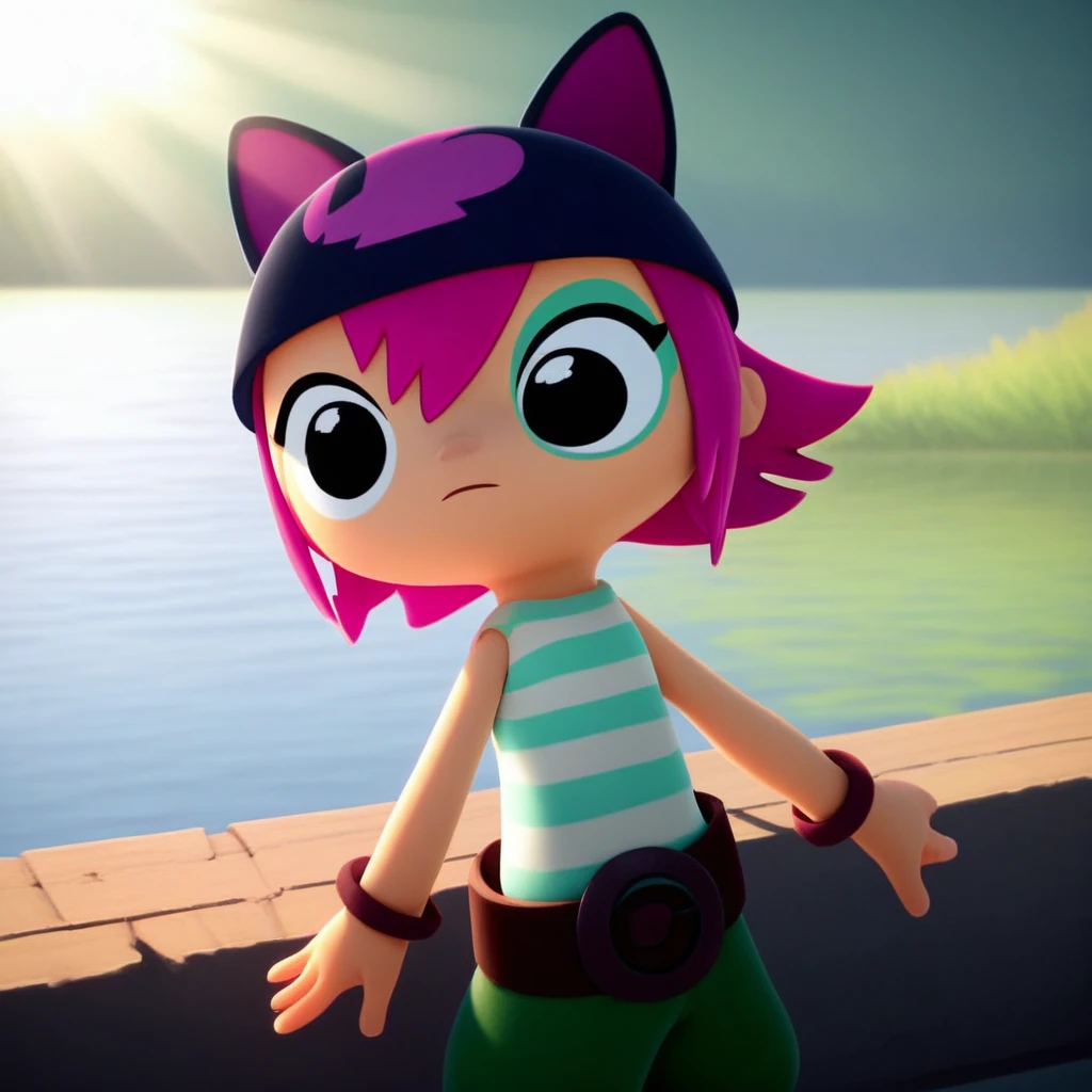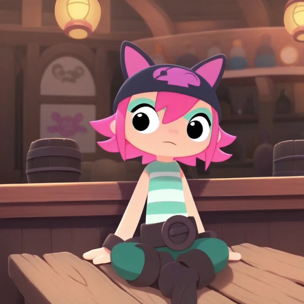 1girl, hat, pink hair, black eyes, striped shirt, belt,