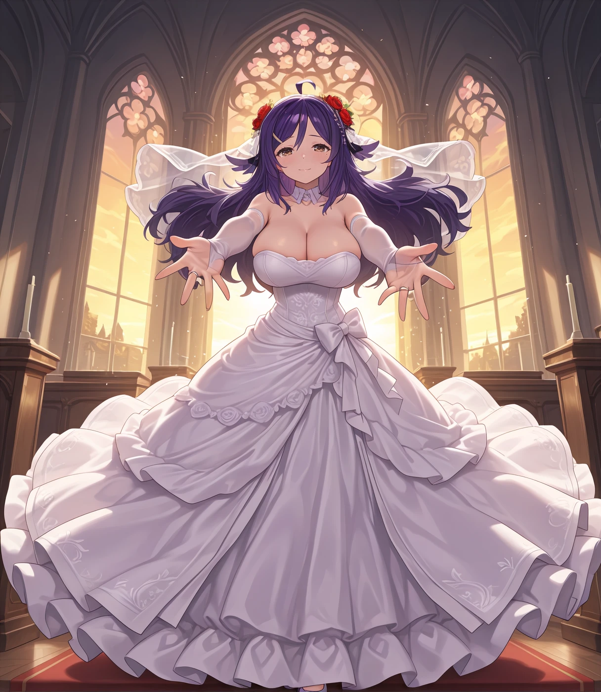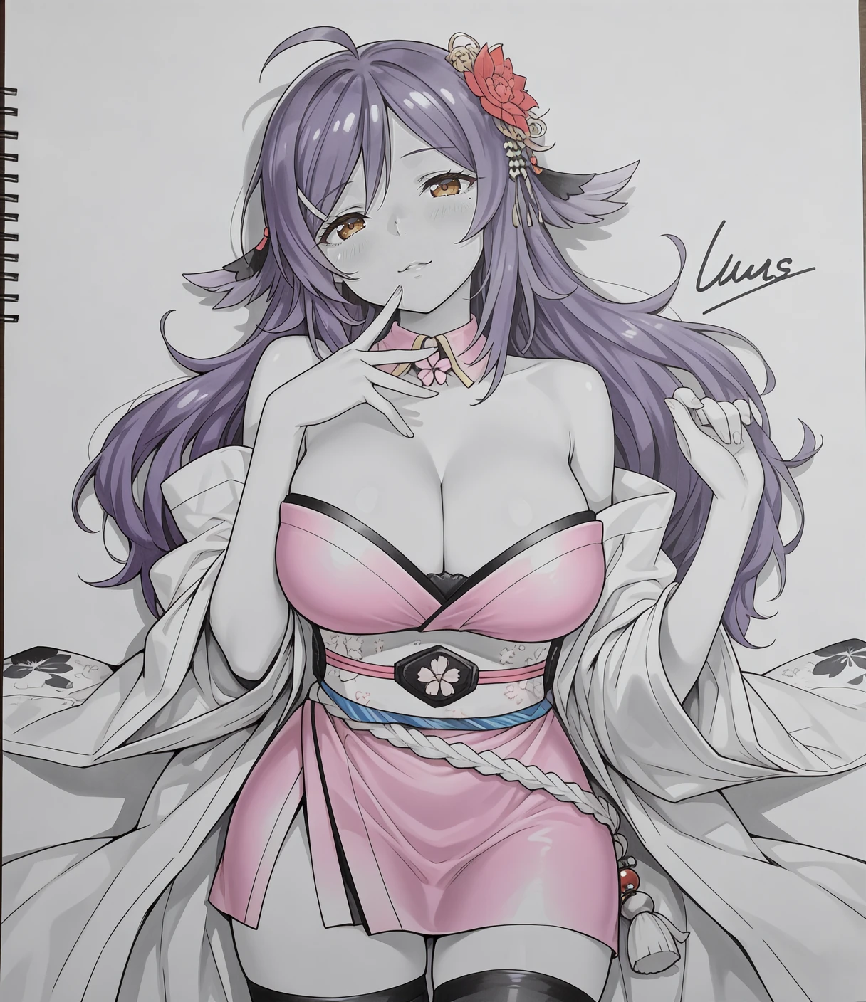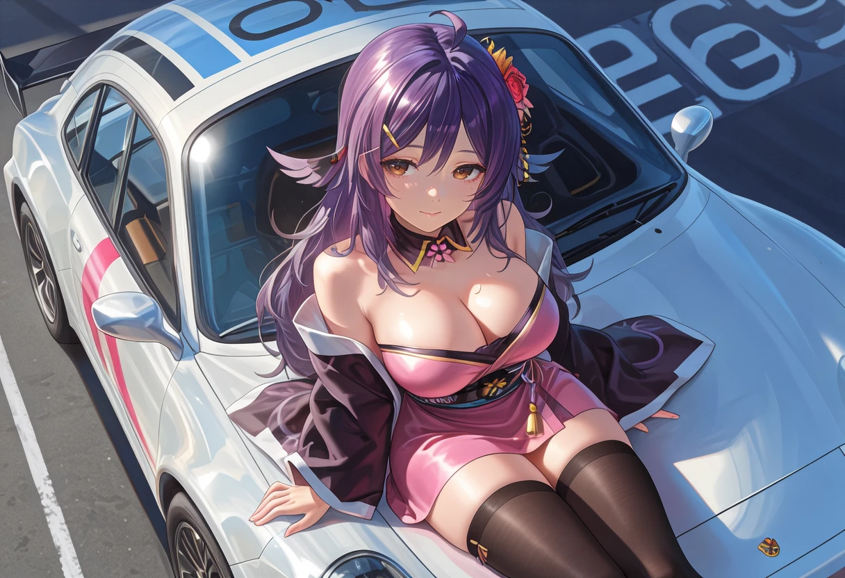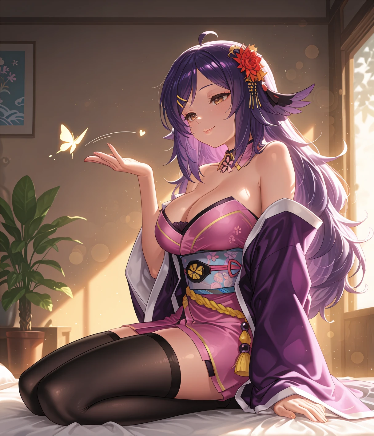 hoshbase, brown eyes, purple hair, long hair, ahoge, hair flower, hair ornament, hairclip, mole under eye, large breasts, cleavage, detached collar, pink dress, short ?????????? shoulder, haori, wide sleeves, long sleeves, obi, zettai ryouiki, black thighhighs, okobo,