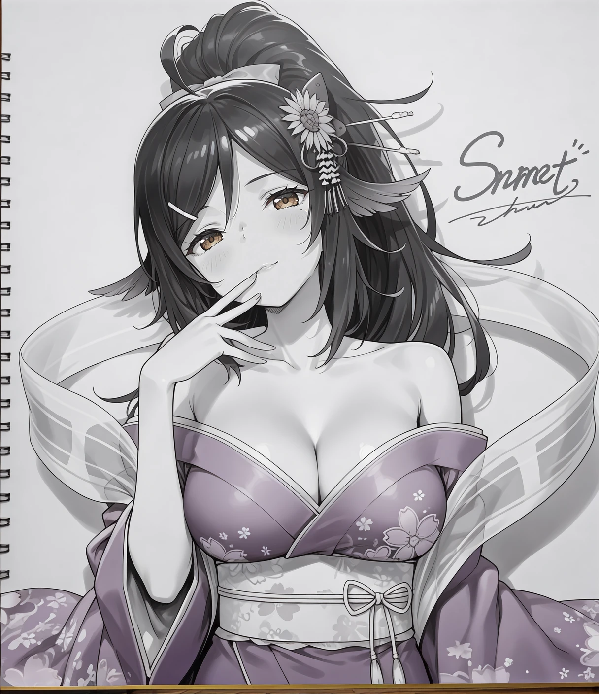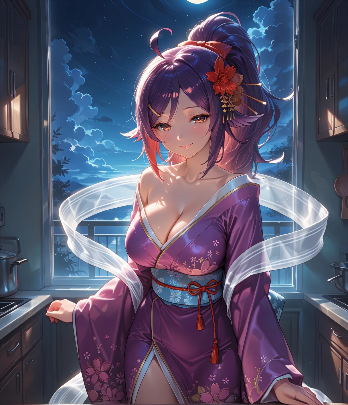 hoshyuka, brown eyes, purple hair, long hair, high ponytail, ahoge, hair flower, hair ornament, hairclip, red hair ribbon, mole under eye, large breasts, cleavage, purple kimono, print kimono, floral print, collarbone, shawl, off shoulder, wide sleeves, long sleeves, obi, white socks, black tabi,