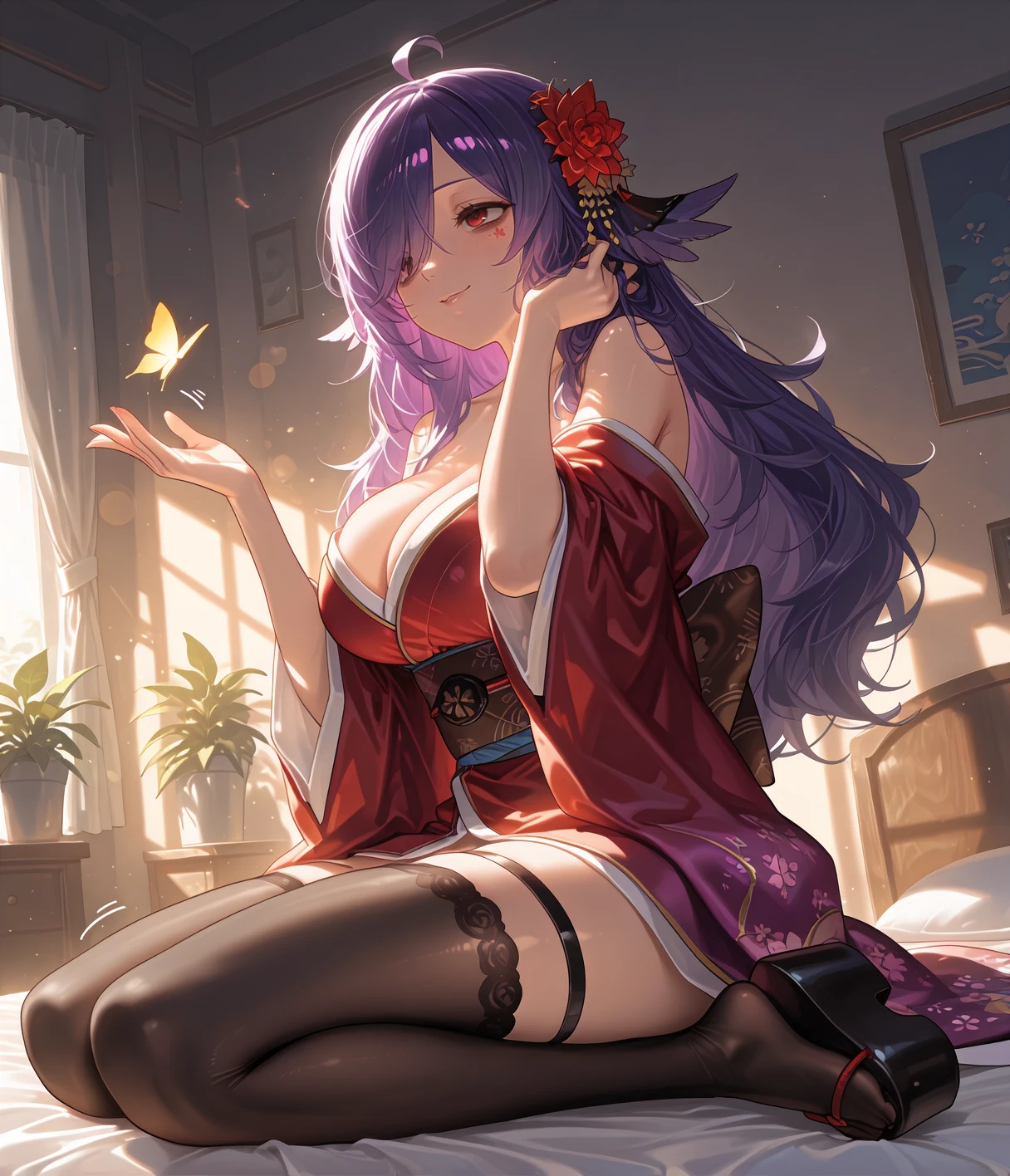 hoshmeta, red eyes, bags under eyes, purple hair, long hair, hair over one eye, ahoge, hair flower, hair ornament, facial mark, large breasts, cleavage, red kimono, bare shoulders, wide sleeves, long sleeves, brown obi, black thighhighs, thigh strap, platform footwear,