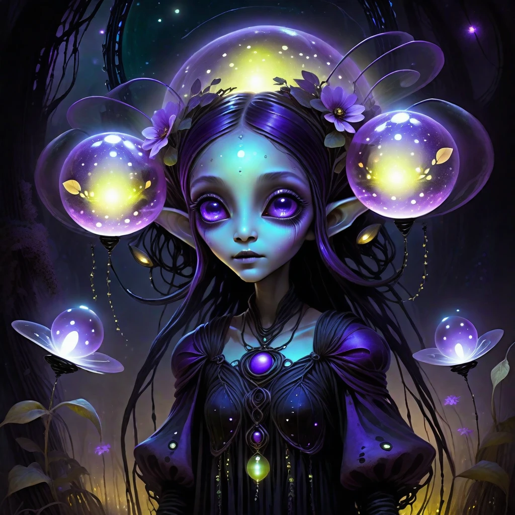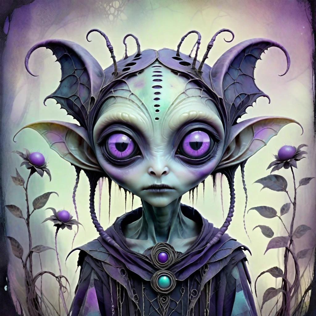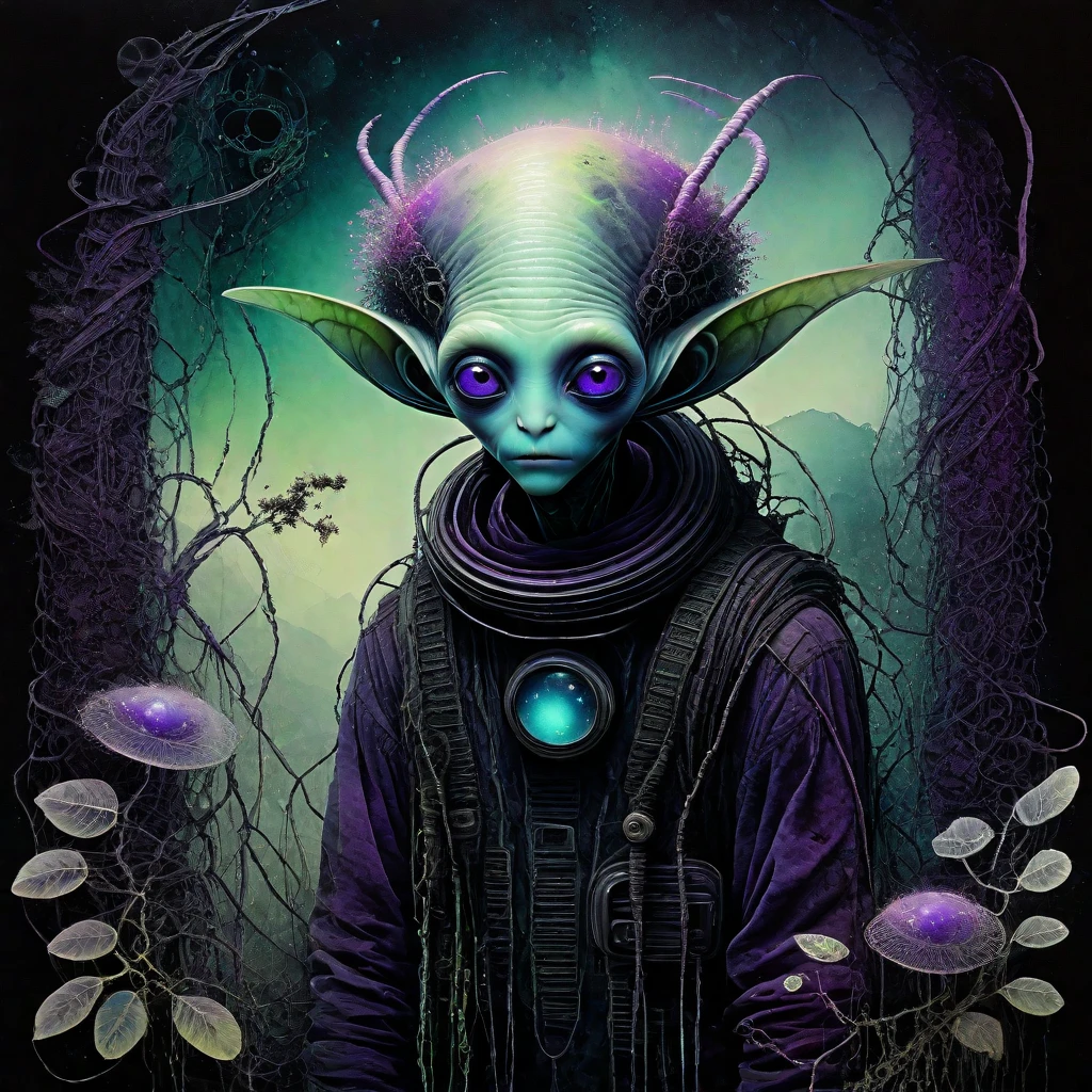 SUBJECTS: Alien child with oversized glowing eyes, Patchwork, tattered clothing with geometric patterns, Overgrown vines and flowers woven into hair, Bioluminescent skin with subtle metallic hints, Surreal fantasy plants with unnatural colors, Black ink-dripped trees with gothic silhouettes, Pansy flowers with neon color splashes, Abstract watercolor puddles on the ground, Dreamlike, foggy background with soft gradients, Small floating firefly-like energy orbs, Hand-stitched gloves and patched fabric details, Gothic-inspired sci-fi footwear, Muted pastel and grunge tones mixed together, Dreamy ink-washed sky with soft clouds, Glowing specks of dust floating around, Delicate, detailed botanical growths, Semi-translucent skin with visible veins, Subtle metallic implants integrated into nature, Painted textures blending sci-fi and nature, Storybook fantasy meets dark surrealism