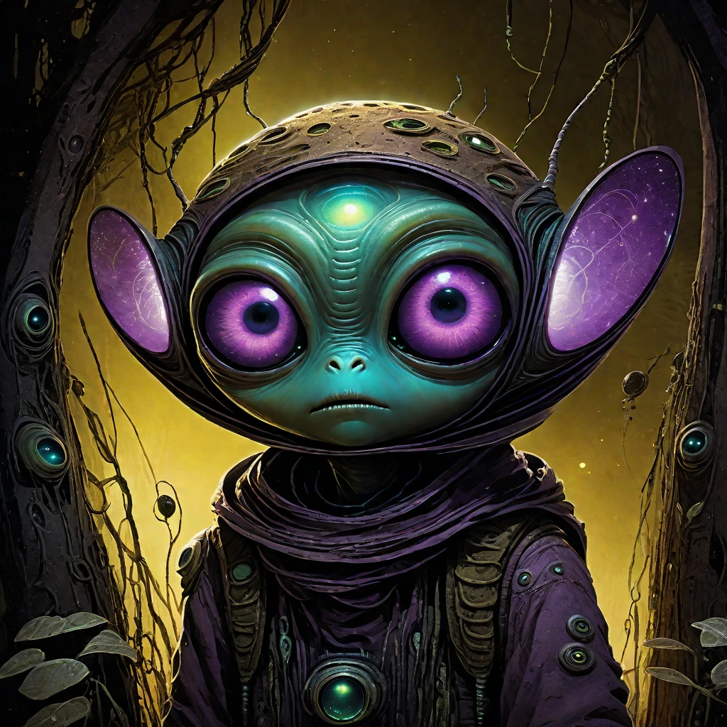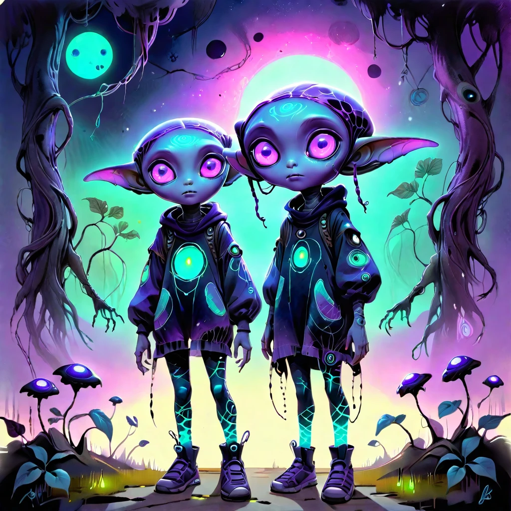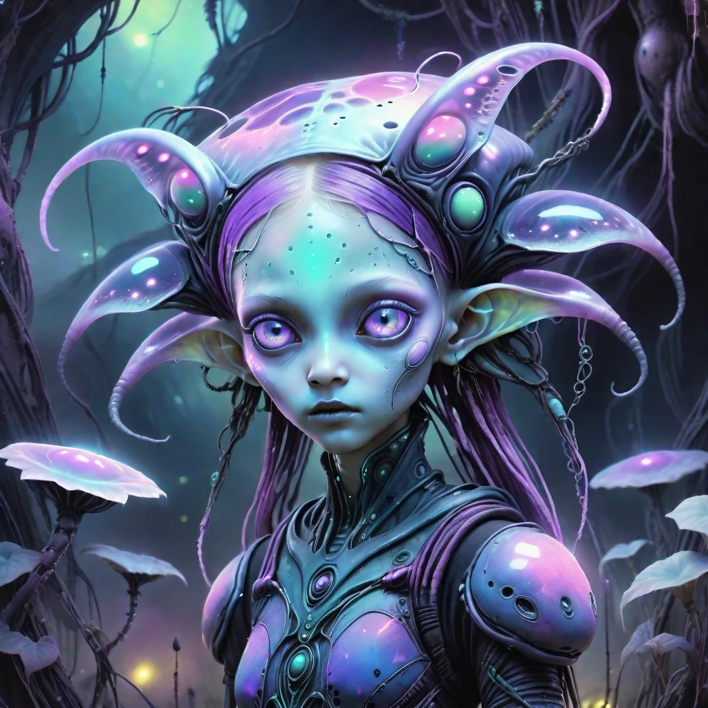 SUBJECTS: Alien child with oversized glowing eyes, Patchwork, tattered clothing with geometric patterns, Overgrown vines and flowers woven into hair, Bioluminescent skin with subtle metallic hints, Surreal fantasy plants with unnatural colors, Black ink-dripped trees with gothic silhouettes, Pansy flowers with neon color splashes, Abstract watercolor puddles on the ground, Dreamlike, foggy background with soft gradients, Small floating firefly-like energy orbs, Hand-stitched gloves and patched fabric details, Gothic-inspired sci-fi footwear, Muted pastel and grunge tones mixed together, Dreamy ink-washed sky with soft clouds, Glowing specks of dust floating around, Delicate, detailed botanical growths, Semi-translucent skin with visible veins, Subtle metallic implants integrated into nature, Painted textures blending sci-fi and nature, Storybook fantasy meets dark surrealism