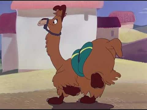 ll4ma, llama, feral, black eyes, brown fur, long ears, brown nose, four legs, two toes, small tail, dark eyelids, long neck, blue saddle, rope