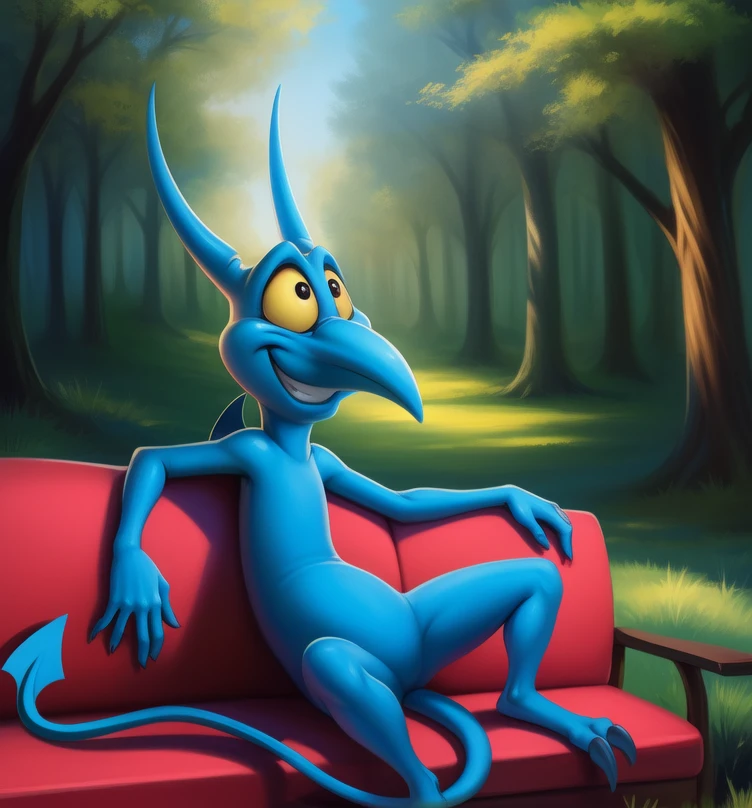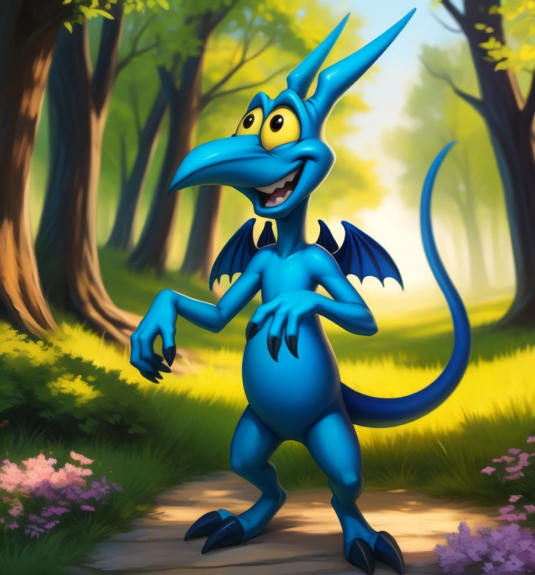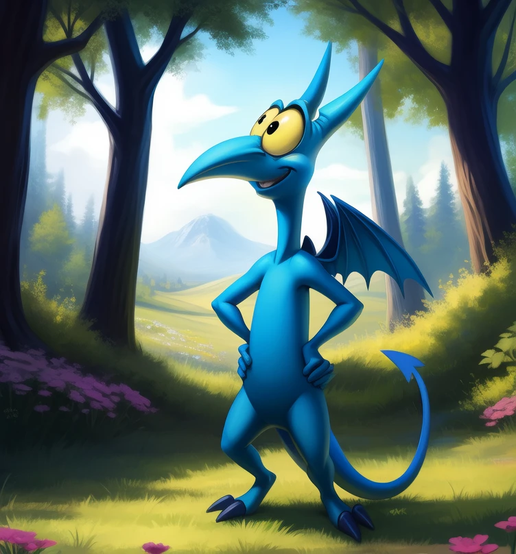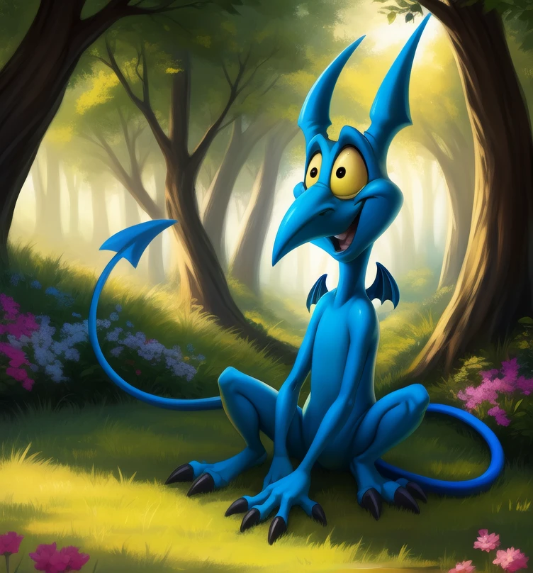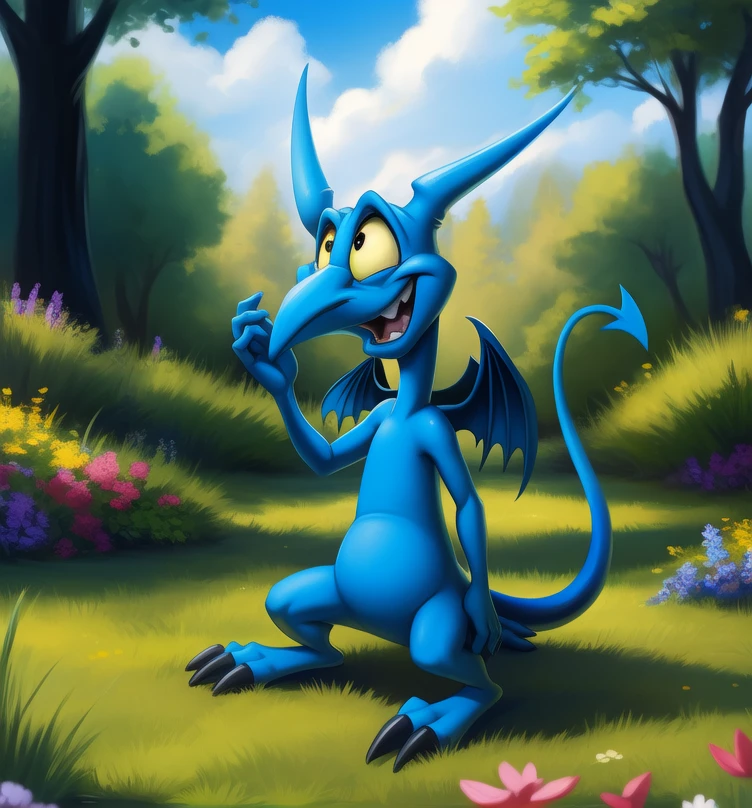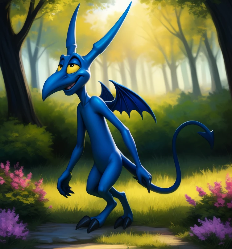 PanicImpHerc1, imp, light blue skin, claws, small wings, yellow sclera, ( pointed tail, chibi, male, boy,)