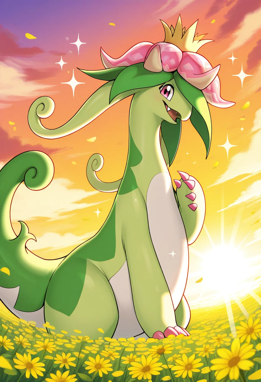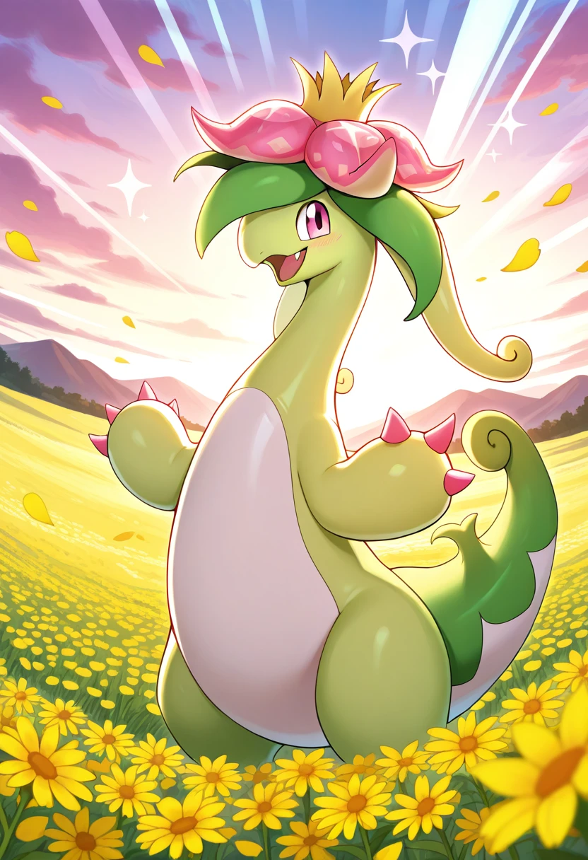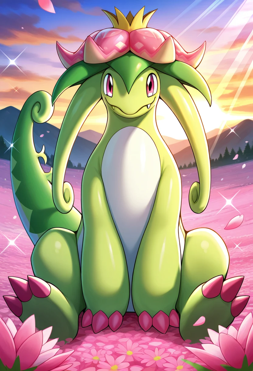 d1nossom_palw0rld, pink eyes, white belly, green body, tail, pink claws, flower