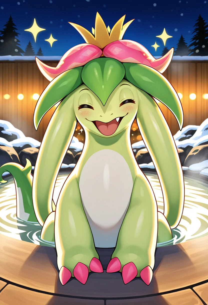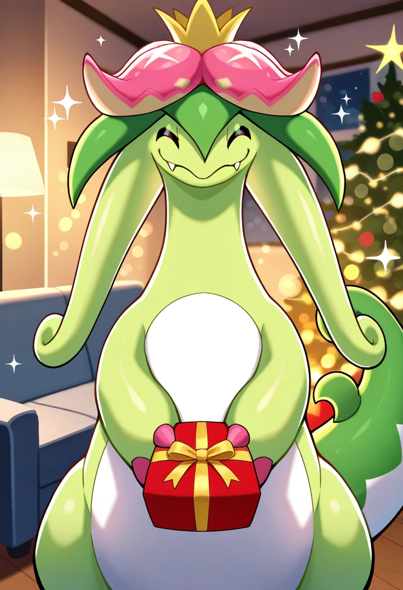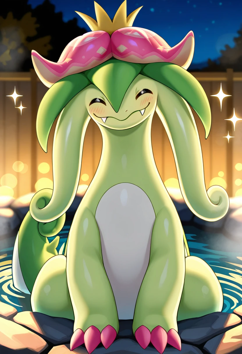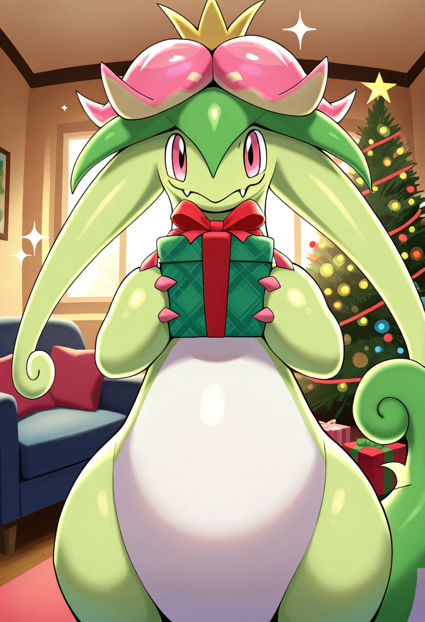 d1nossom_palw0rld, pink eyes, white belly, green body, tail, pink claws, flower