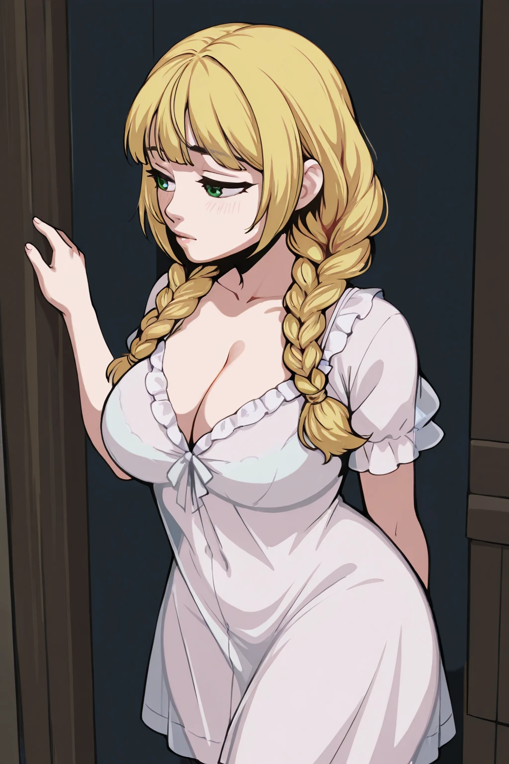 blonde hair, ponytail, large breasts, angel wings, black wings, blue eyes, black lips, hairclip