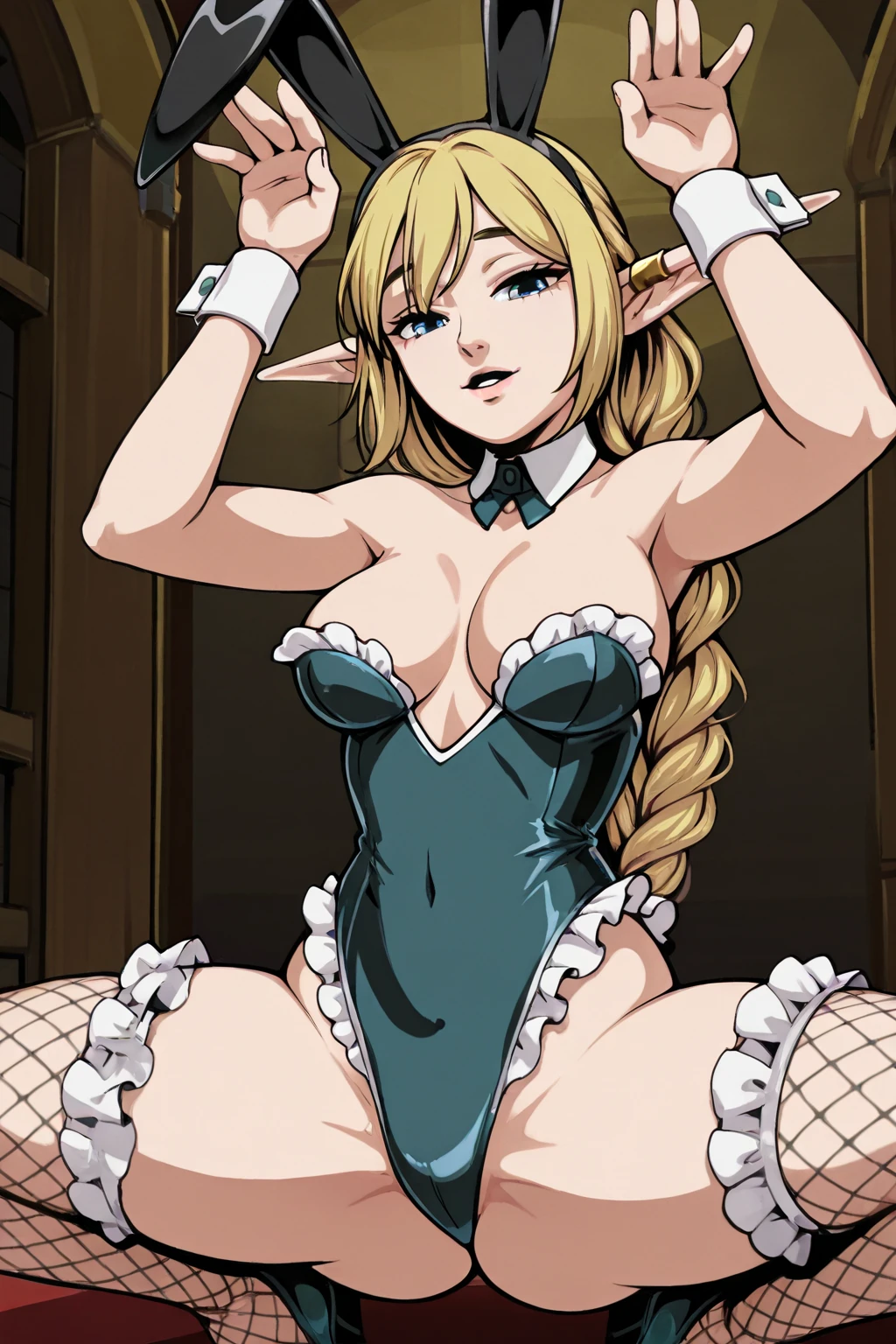 elf, long ears, purple lips, piercing, lip piercing, mouth piercing, pink eyes, red hair, very long hair, single braid
