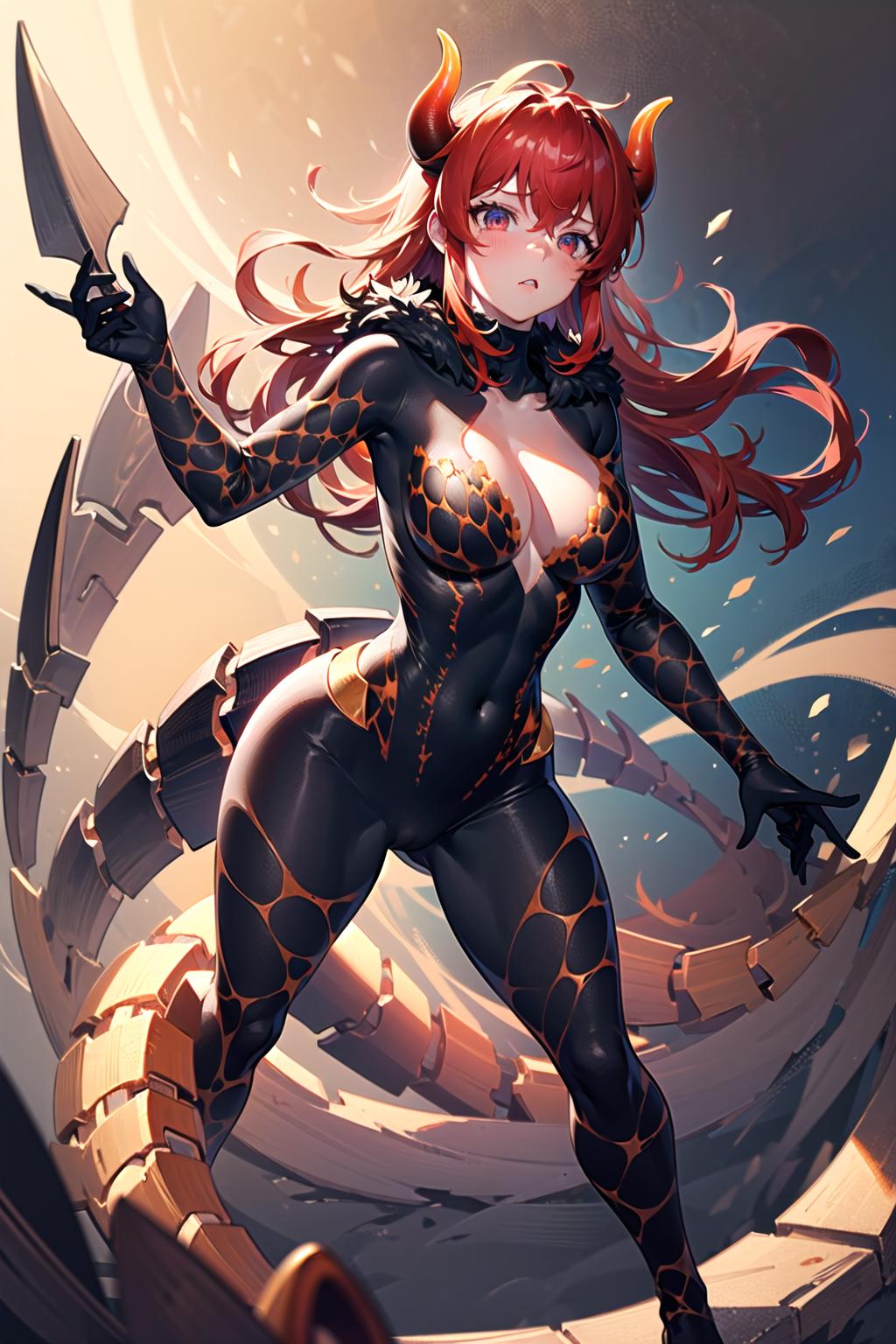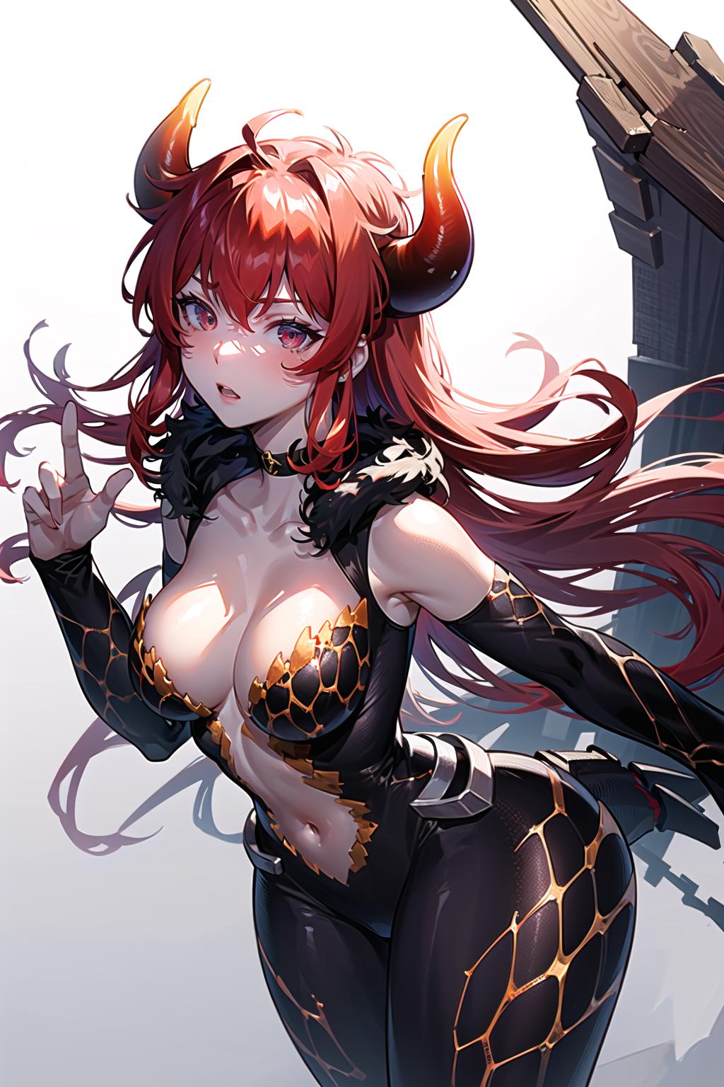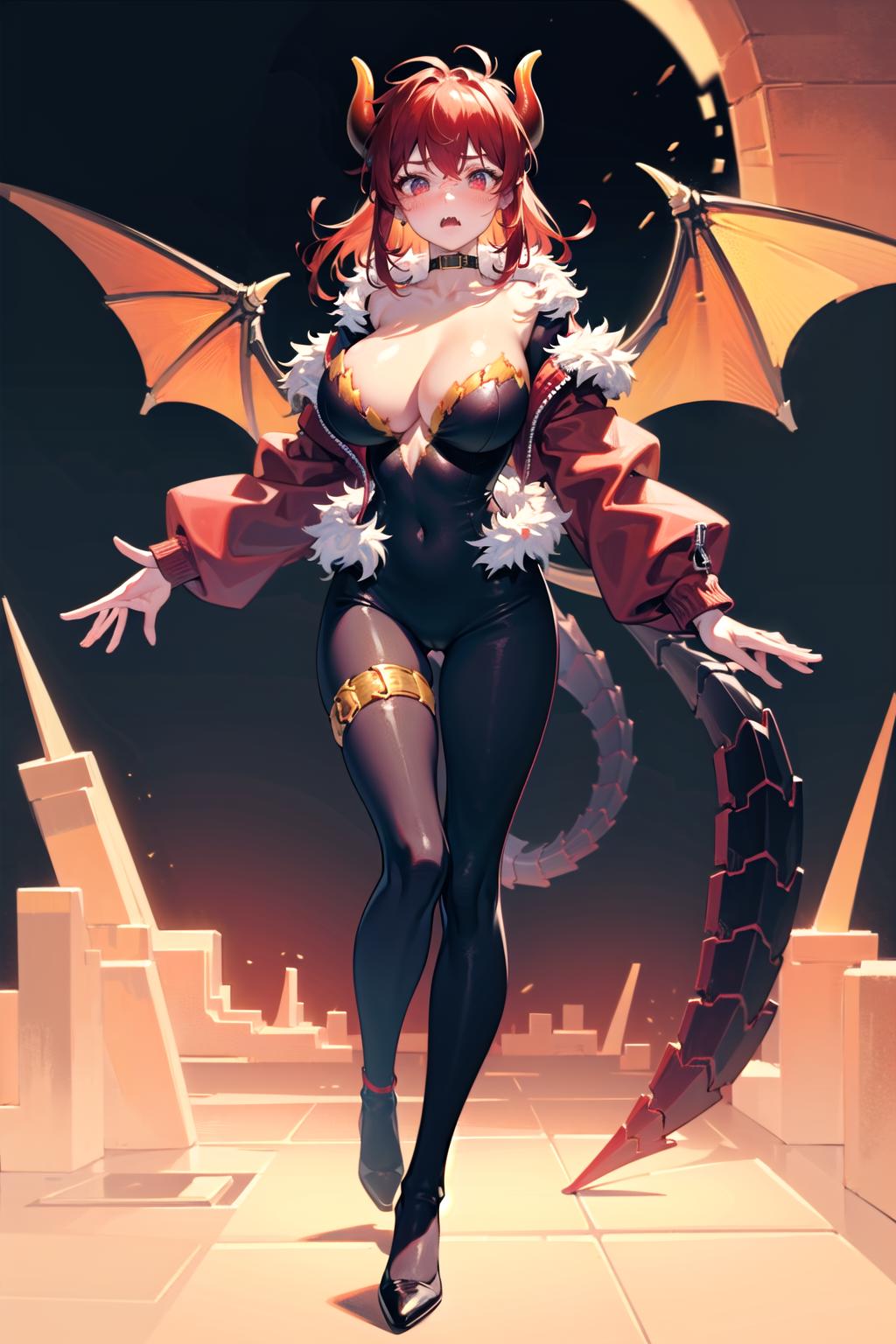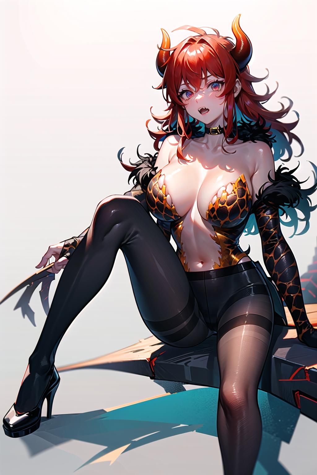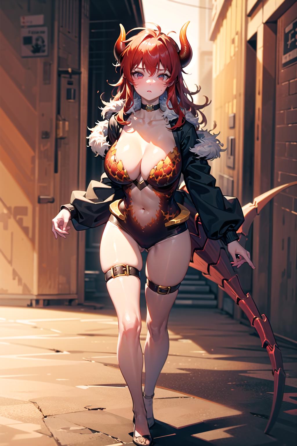 Prompts: dola \(nijisanji\),dragon girl,solo,red hair,horns,red eyes,dragon horns,large breasts,cleavage,blush,hair between eyes,dragon tail,tail,navel,thigh strap,collarbone,choker,huge breasts,scales,fangs,black footwear,strap slip