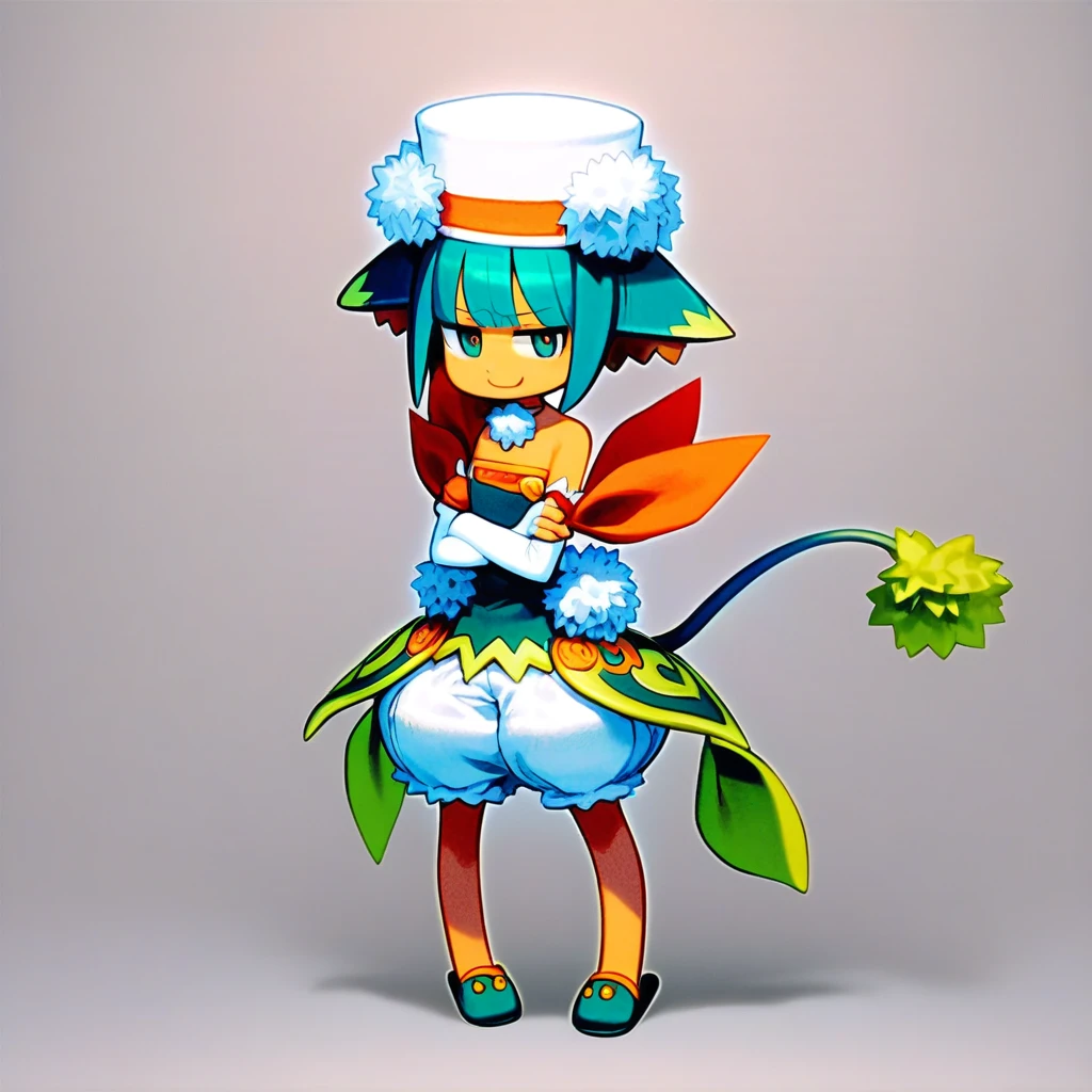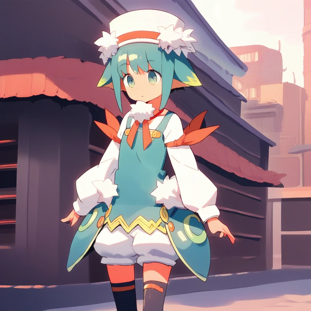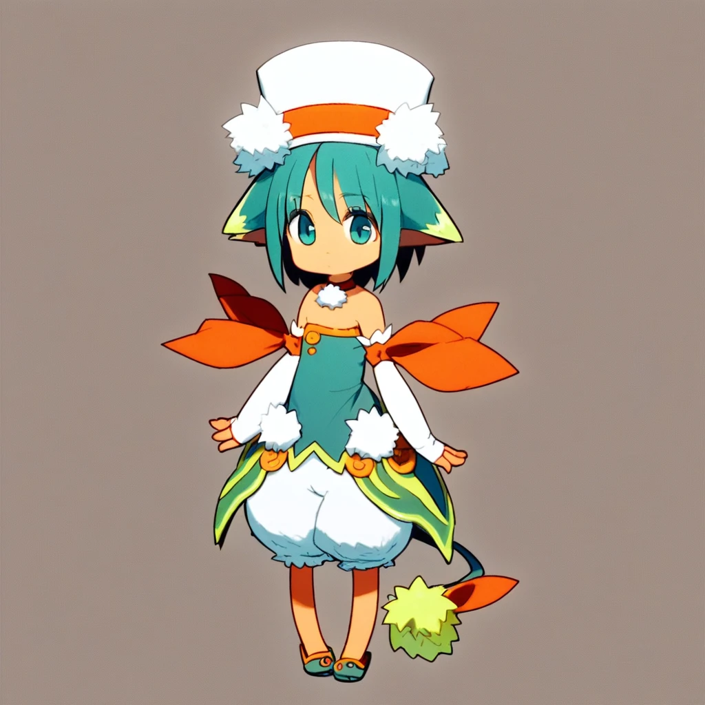Prompts: Rufeel_SCS, monster girl, hat, animal ears, aqua hair, pom pom (clothes), choker, strapless shirt, bare shoulders, green shirt, puffy shorts, fur shorts, elbow gloves, fingerless gloves, ribbon, tail, slippers