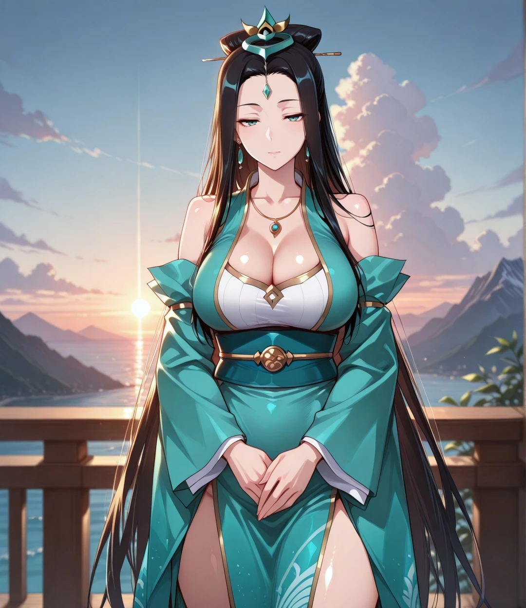 suqingge, 1girl, aqua eyes, black hair, long hair, large breasts,