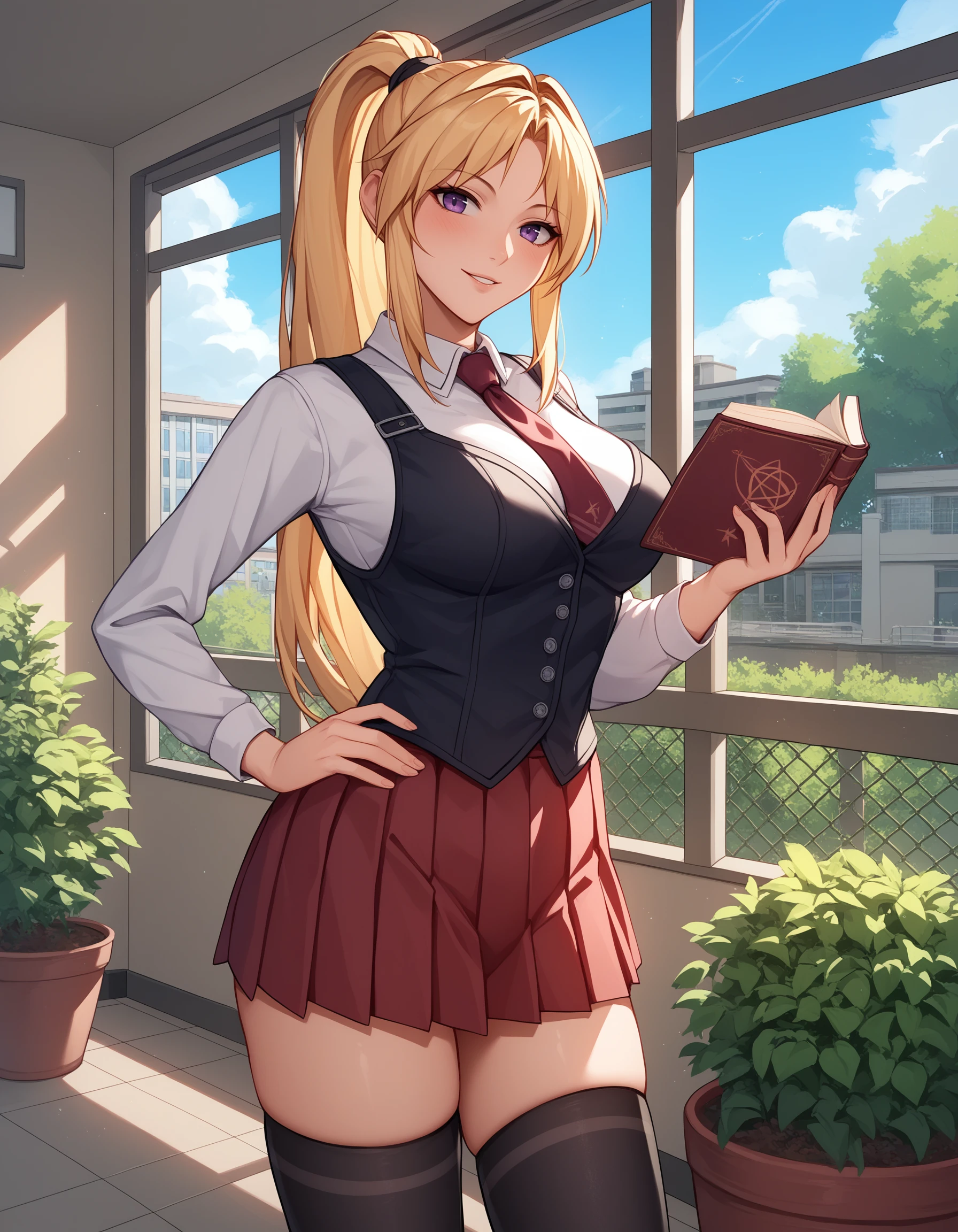 school uniform, collared shirt, white shirt, vest, suspenders, red skirt, pleated skirt, miniskirt, black thighhighs, red necktie