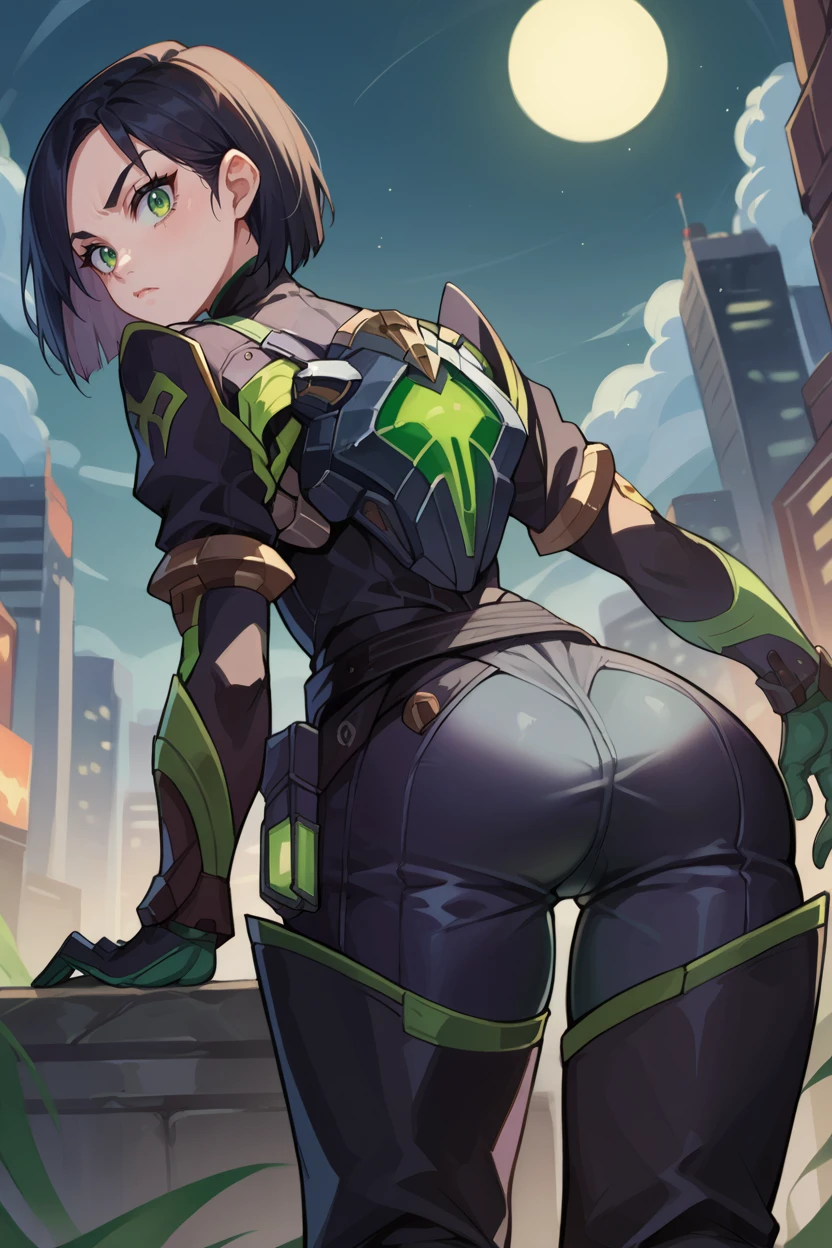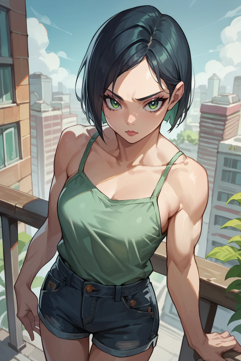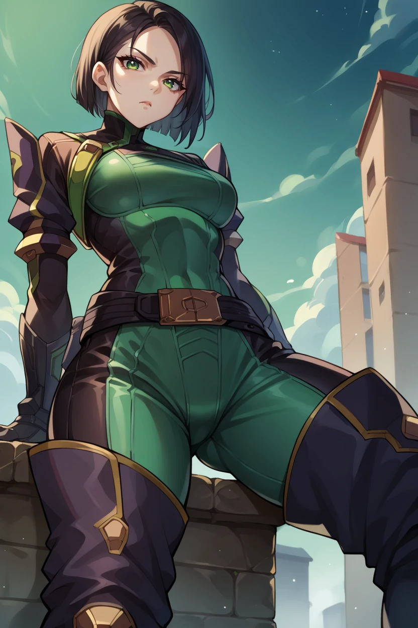 Add "green and black bodysuit, black gloves, belt, thigh boots" for her typical look.
