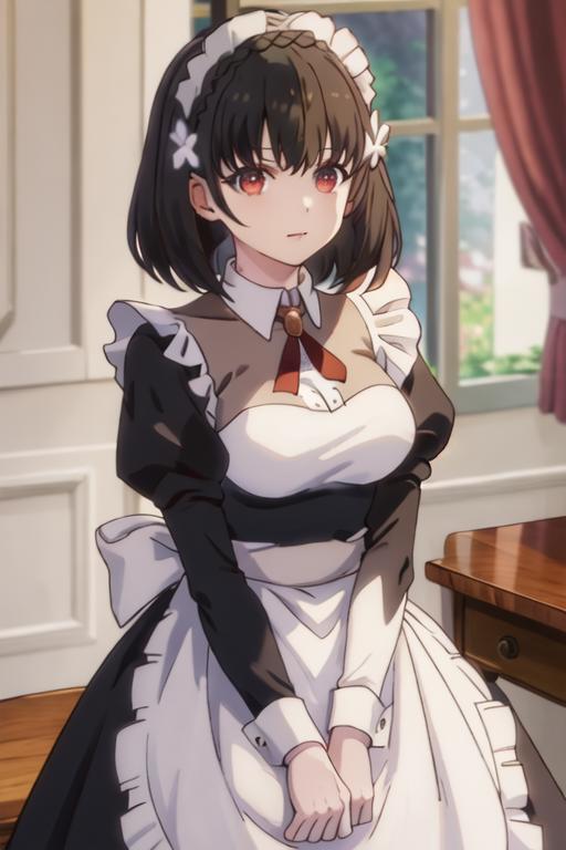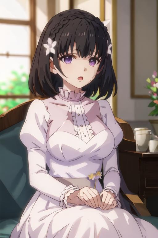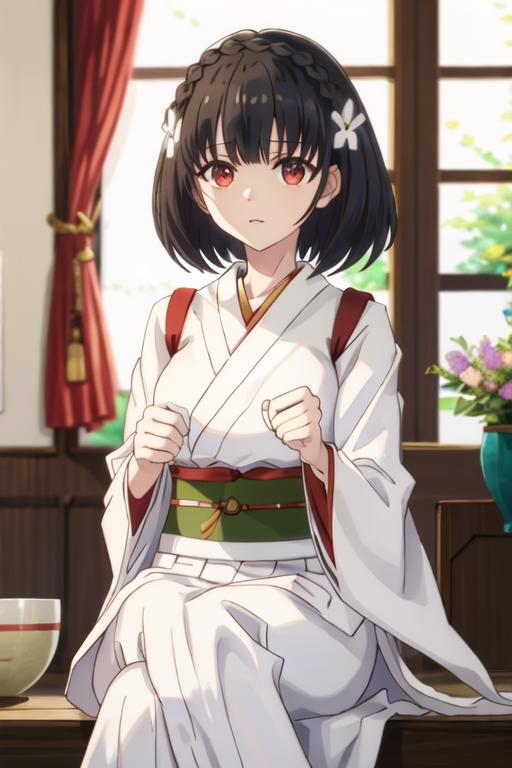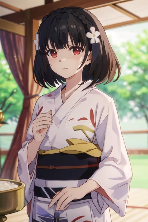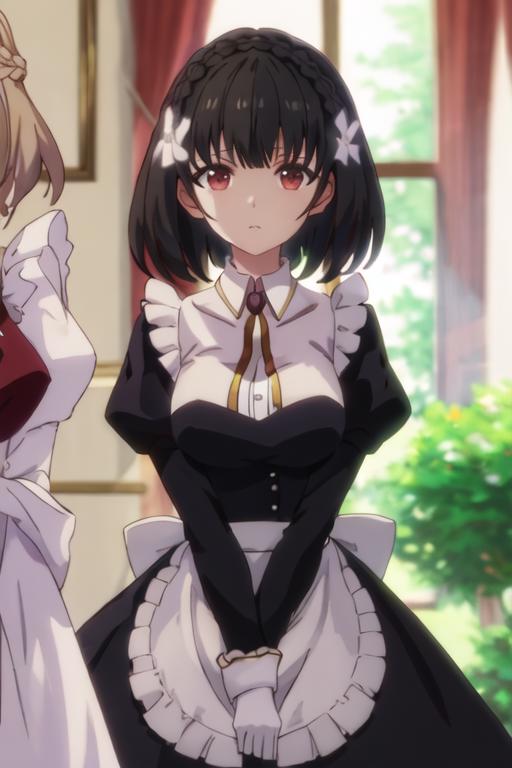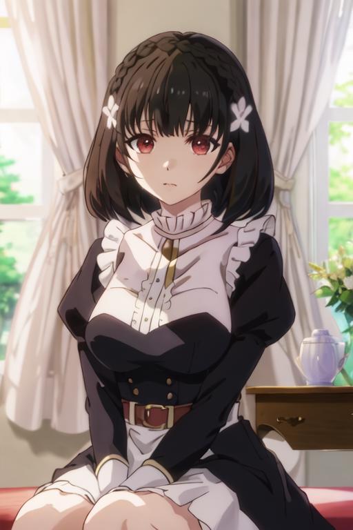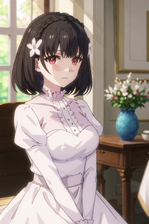 The trigger word is lainie_cyan_tenseioujototensaireijounomahoukakumei, and the recommended tags are best quality, masterpiece, highres, solo, {lainie_cyan_tenseioujototensaireijounomahoukakumei:1.15}, black_hair, short_hair, hair_ornament, bangs, flower, hair_flower, braid, crown_braid, blurry, red_eyes.
