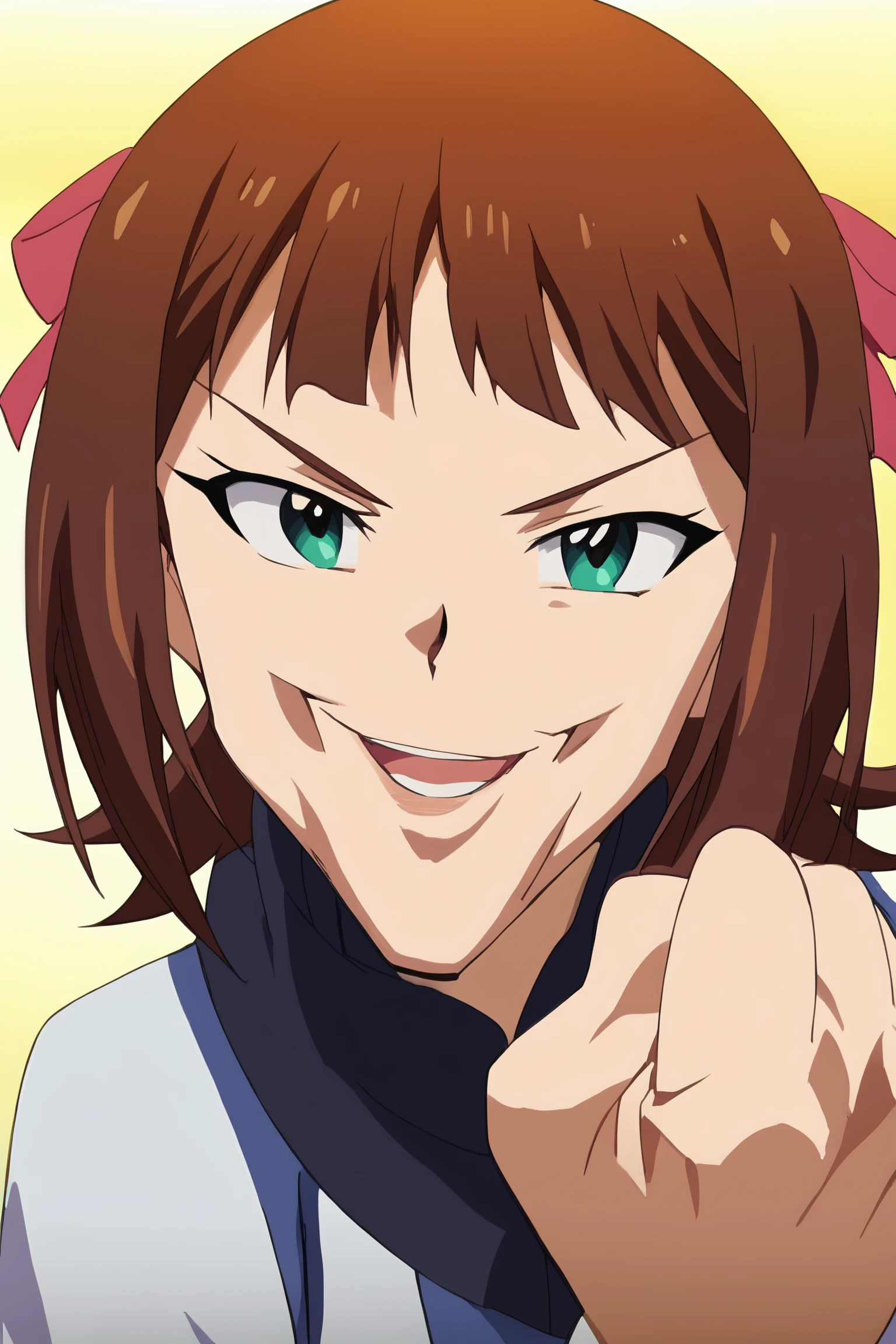 Haruka Amami, 1girl, brown hair, short hair, green eyes, hair ribbon