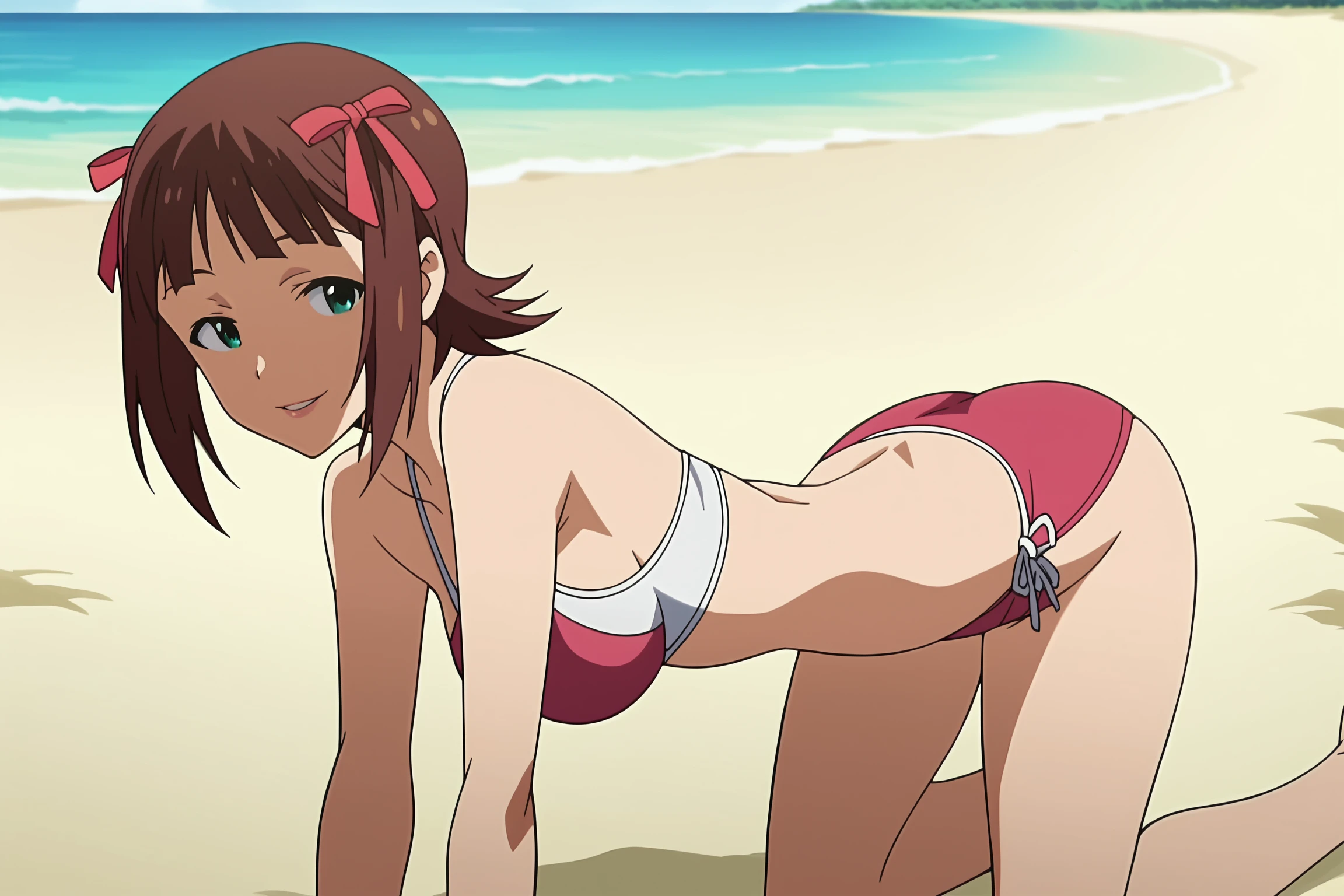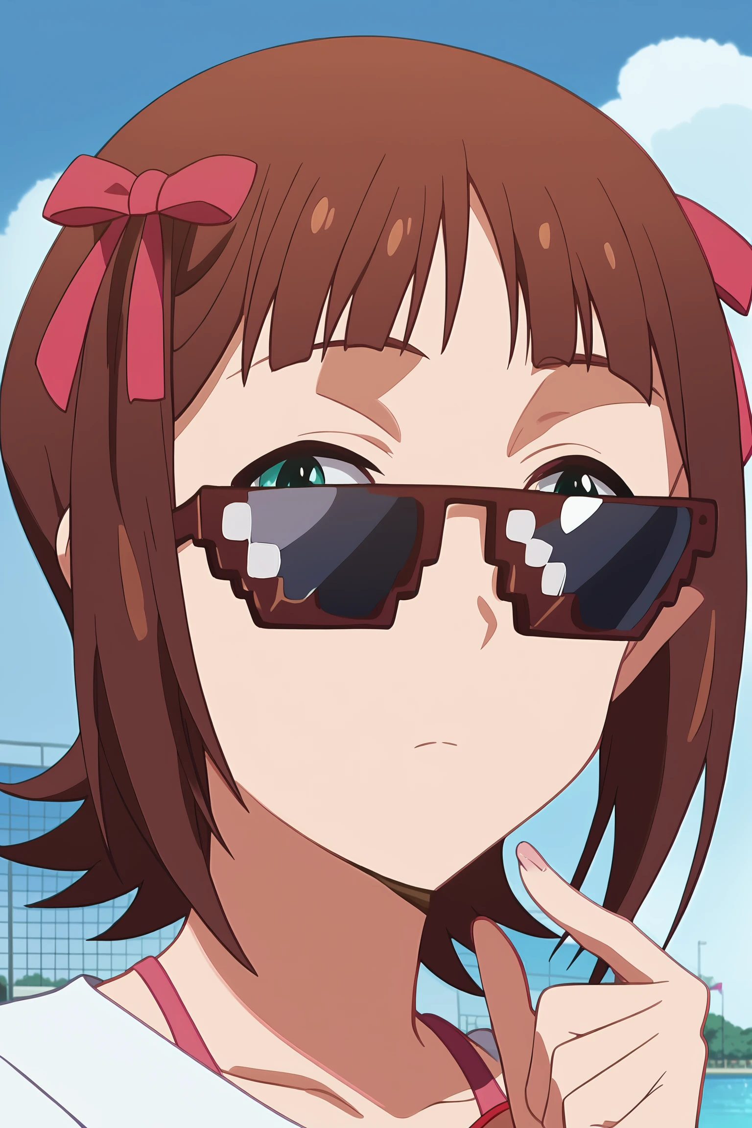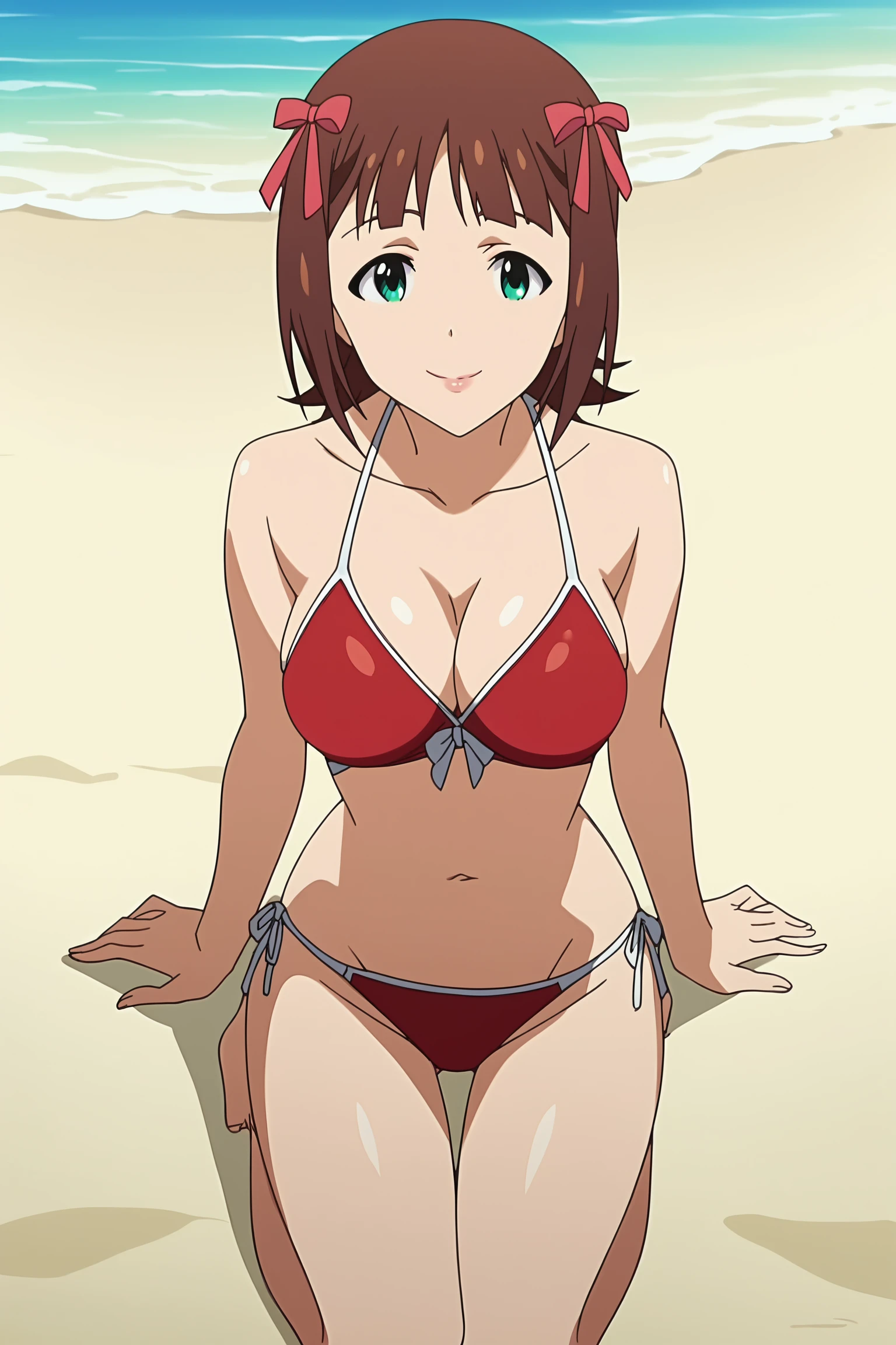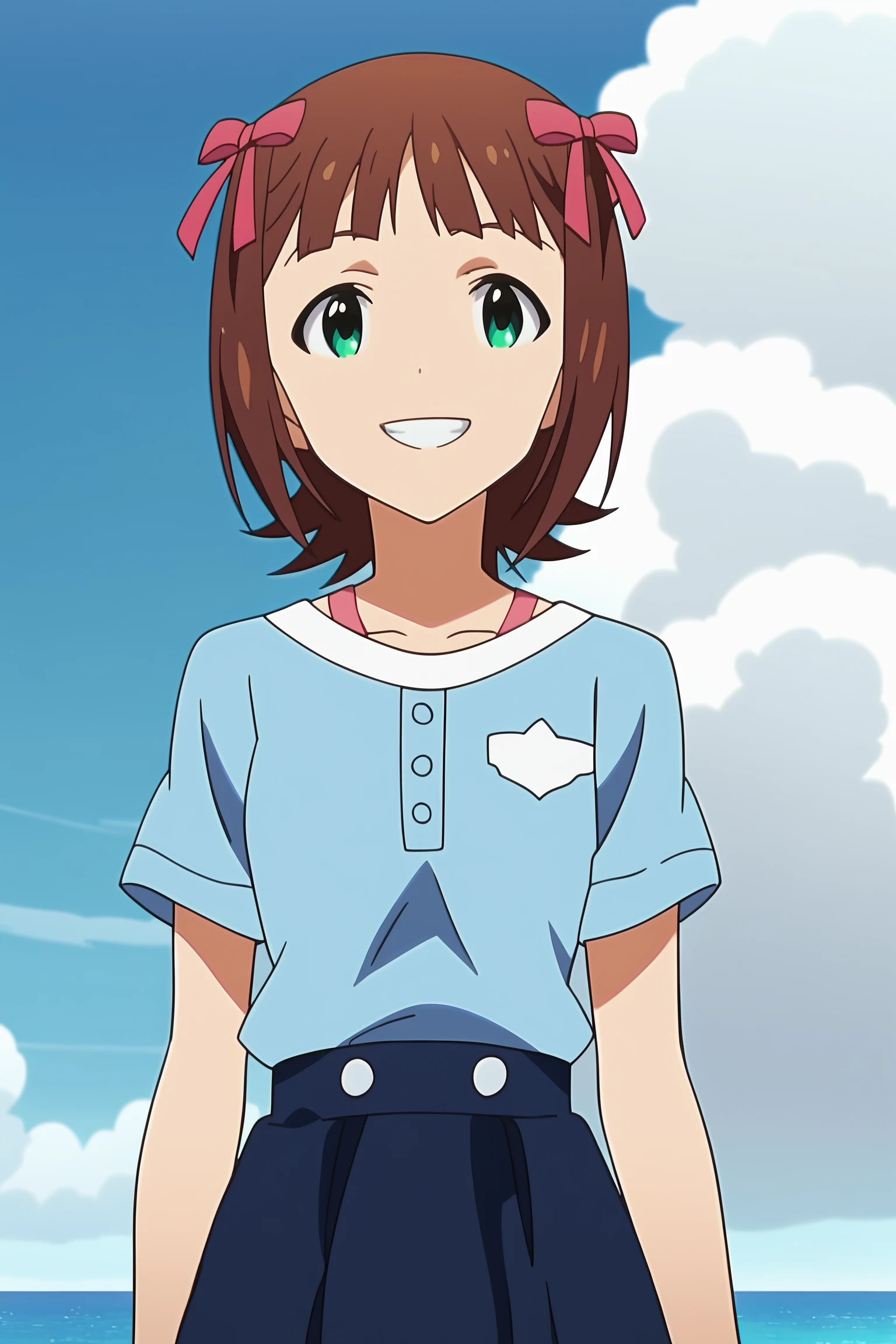 Standard keywords: Haruka Amami, 1girl, brown hair, short hair, green eyes, hair ribbon