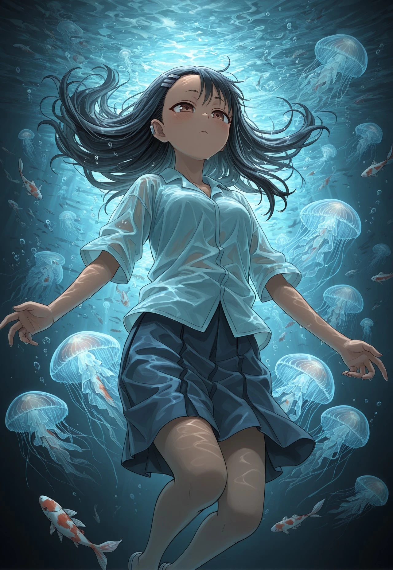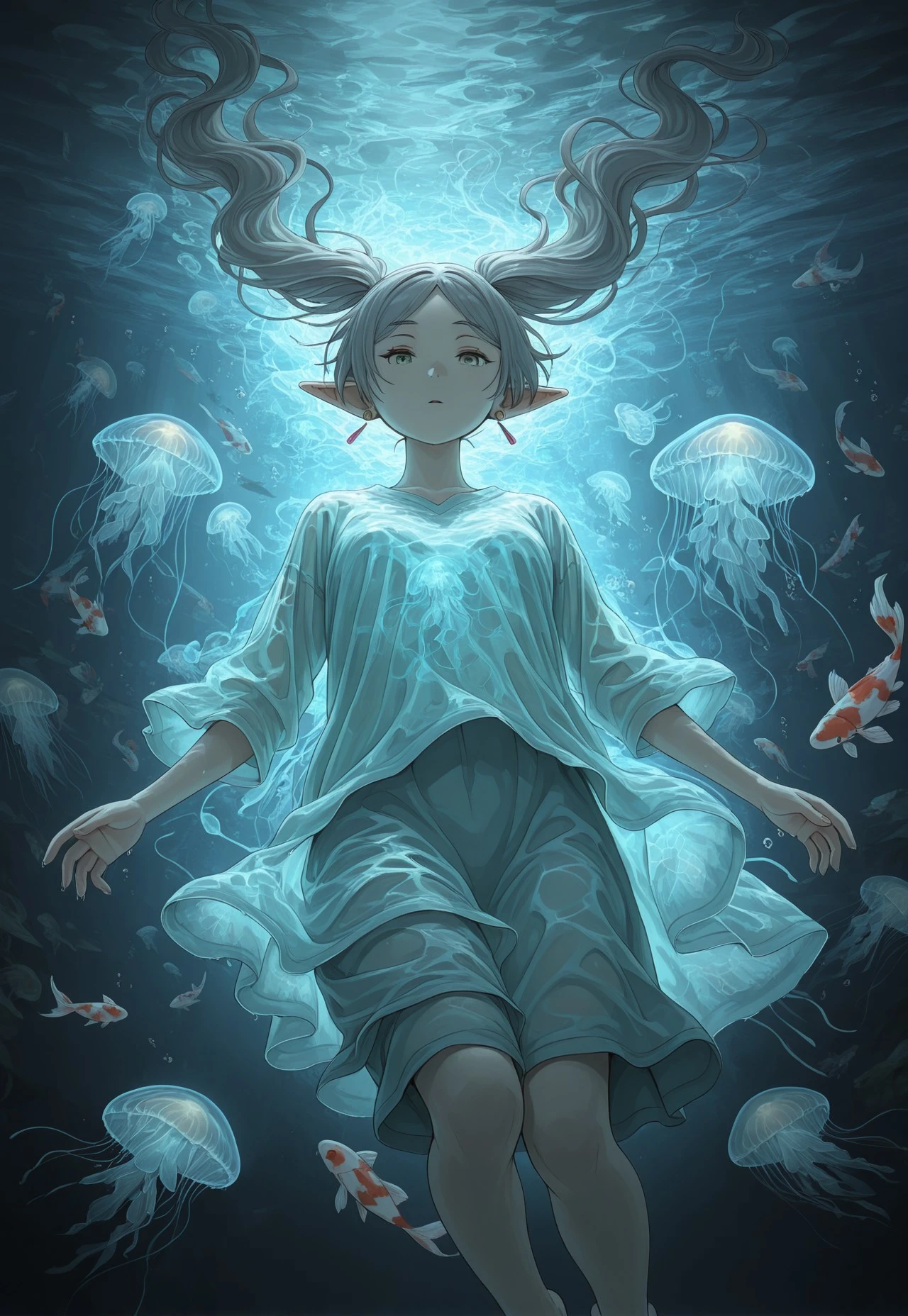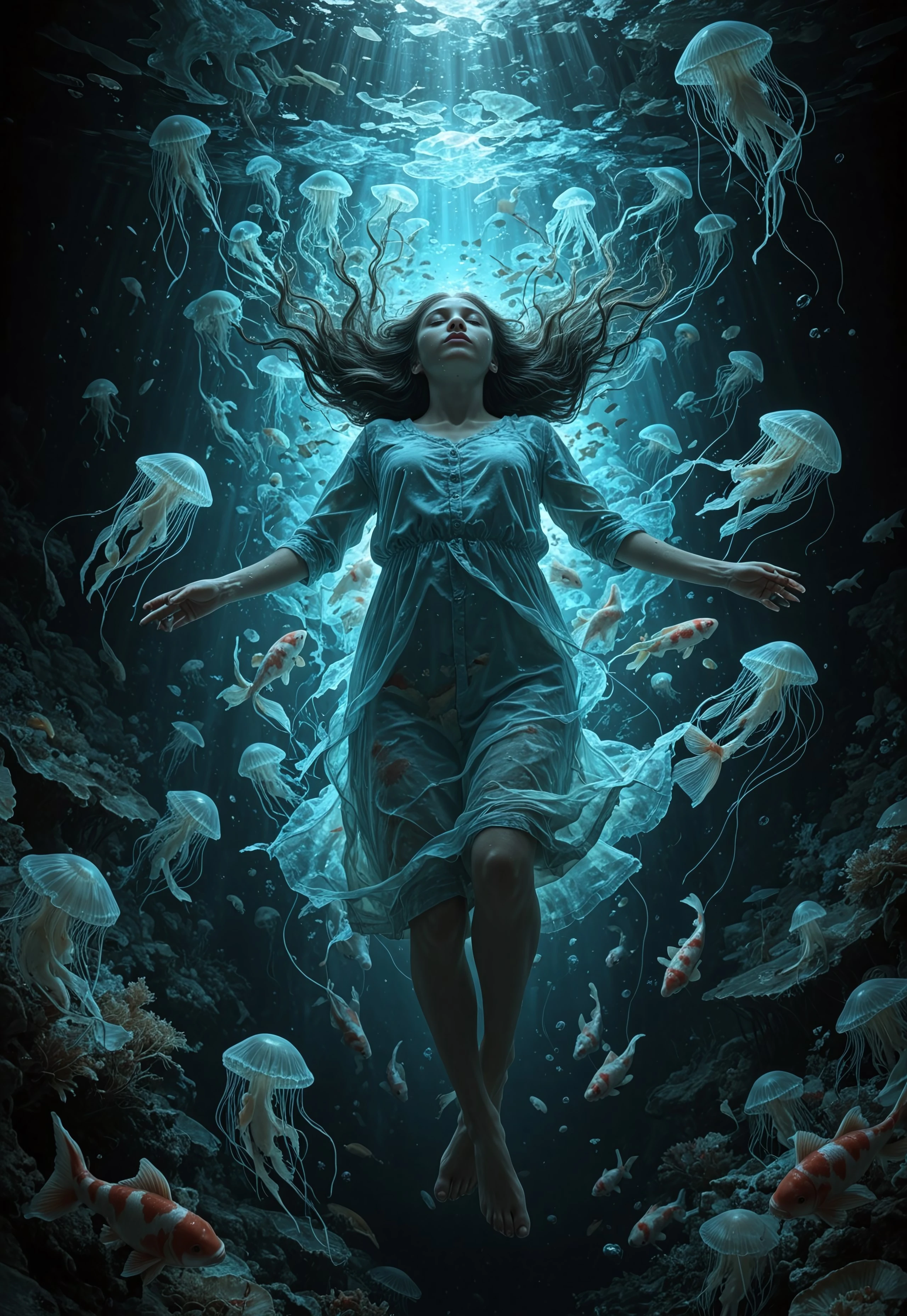 Undwatmb2, underwater scene, floating underwater, dreamy atmosphere, ethereal glow, jellyfish, koi fish, flowing clothes, wet clothes,