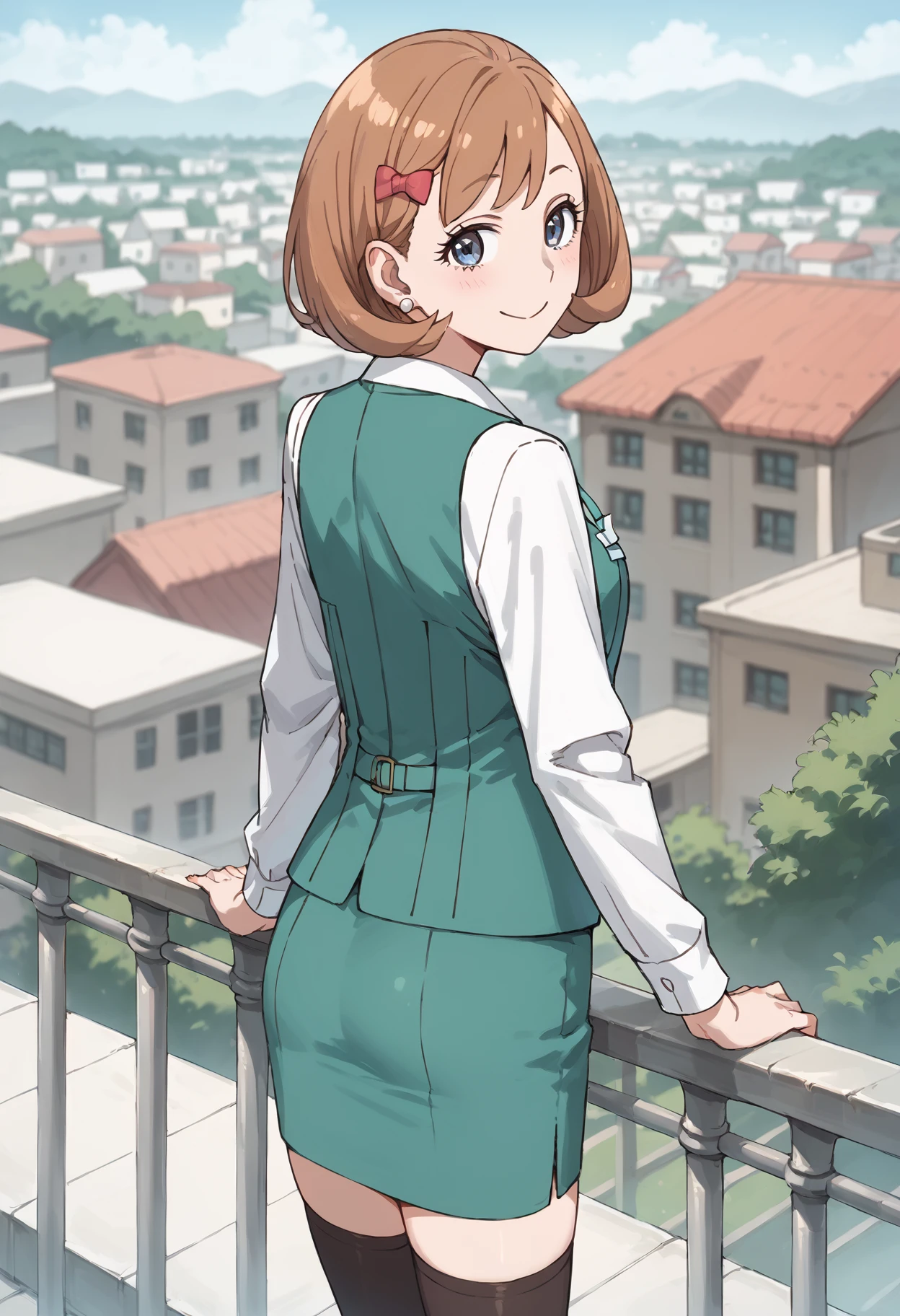 hairclip, pencil skirt, green vest, white shirt, long sleeves, black thighhighs