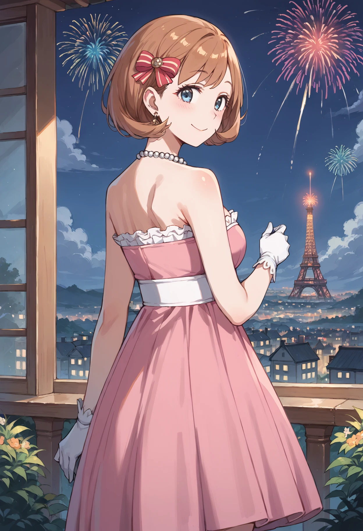 pink dress, hair bow, white gloves, strapless dress, white belt, pearl necklace, earringsAdd these if necessary / 需要があれば、これらを加える / 自由選用區: