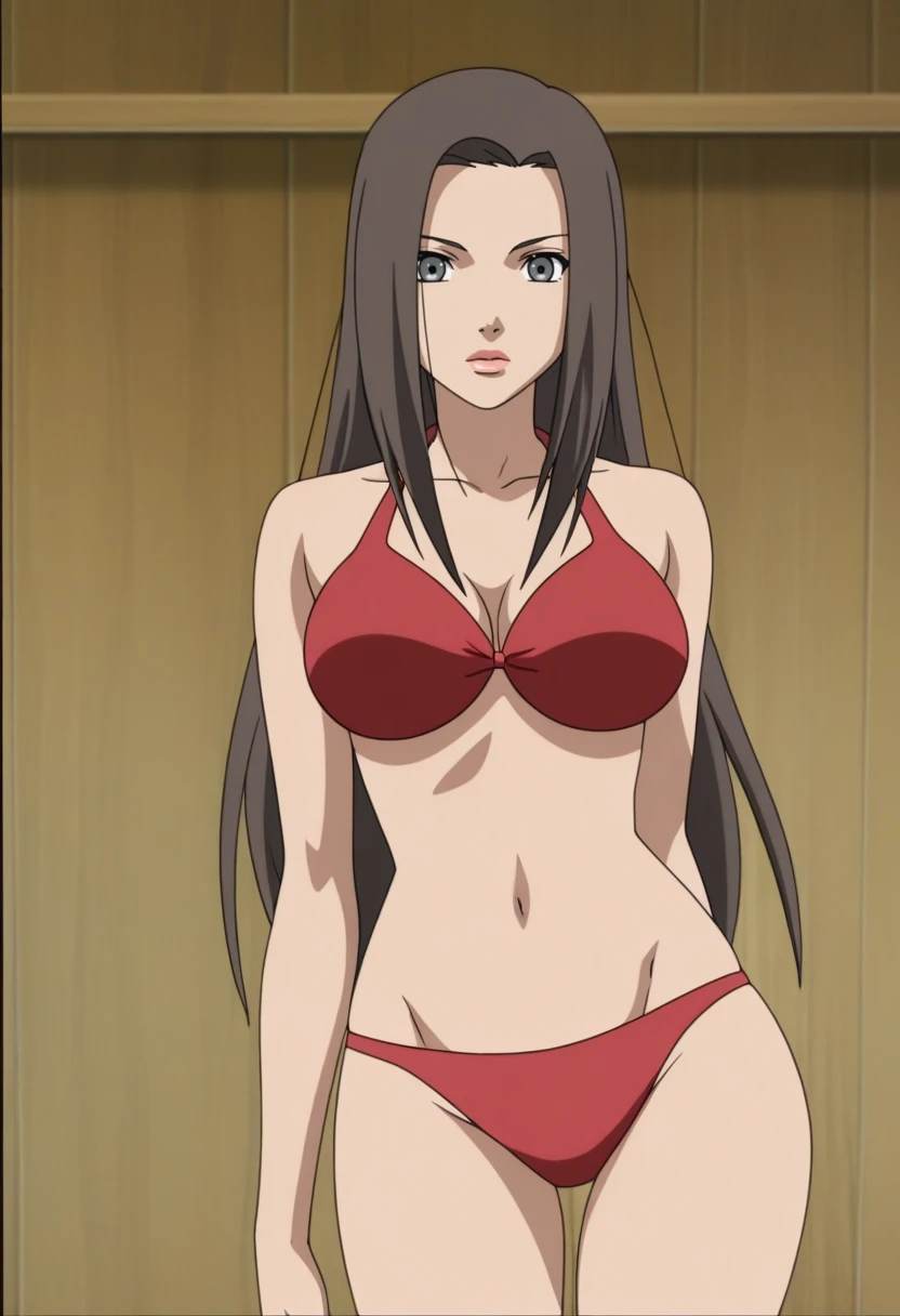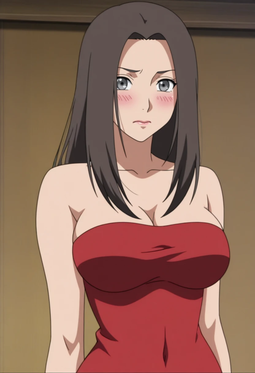 masterpiece, best quality, game screencap, game cg, shiny skin, konohamaruSJ, 1girl, solo, dark brown hair, long hair, parted bangs, grey eyes, large breasts, lip gloss, dark red mini tube slim dress, strapless, anime screencap