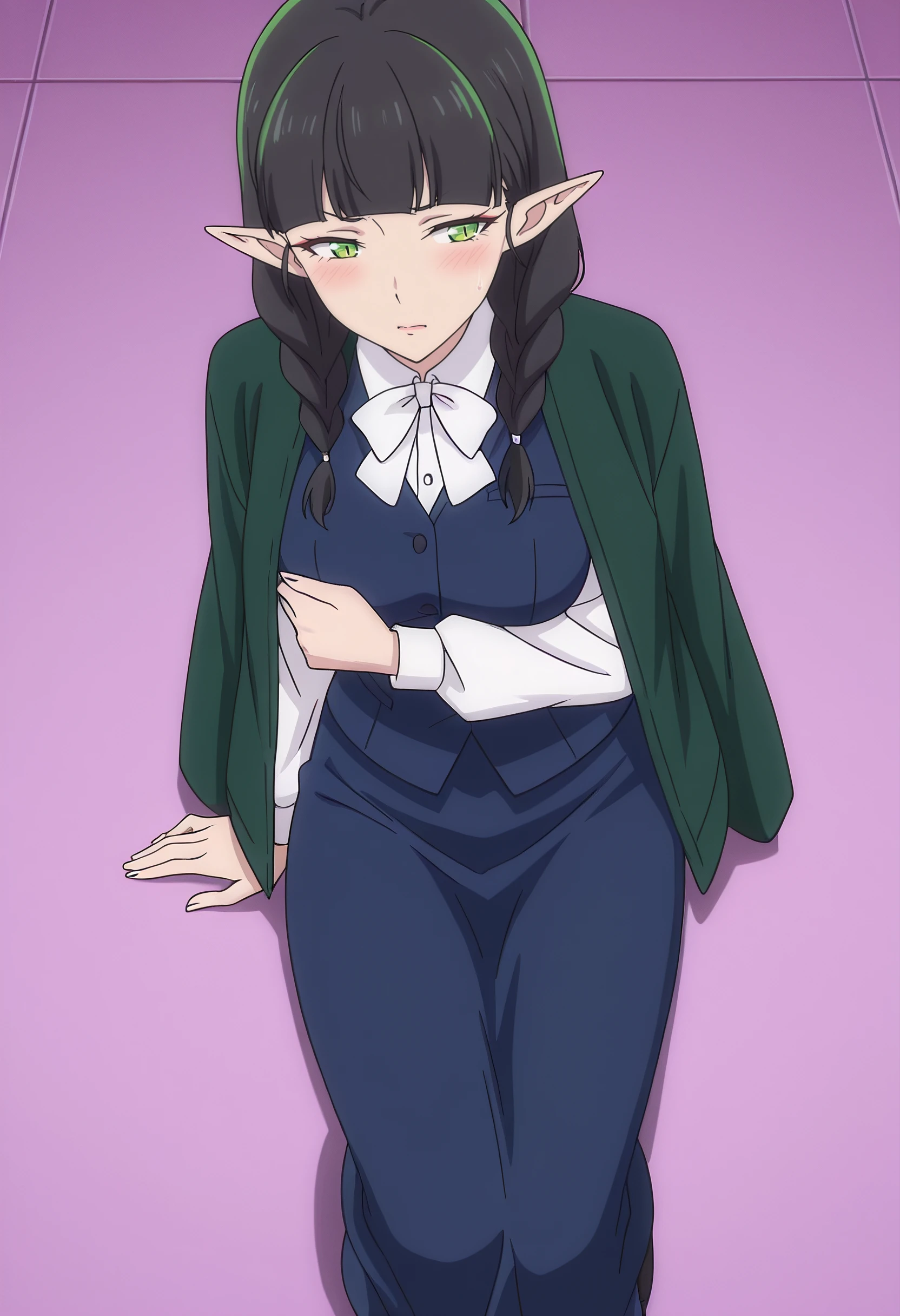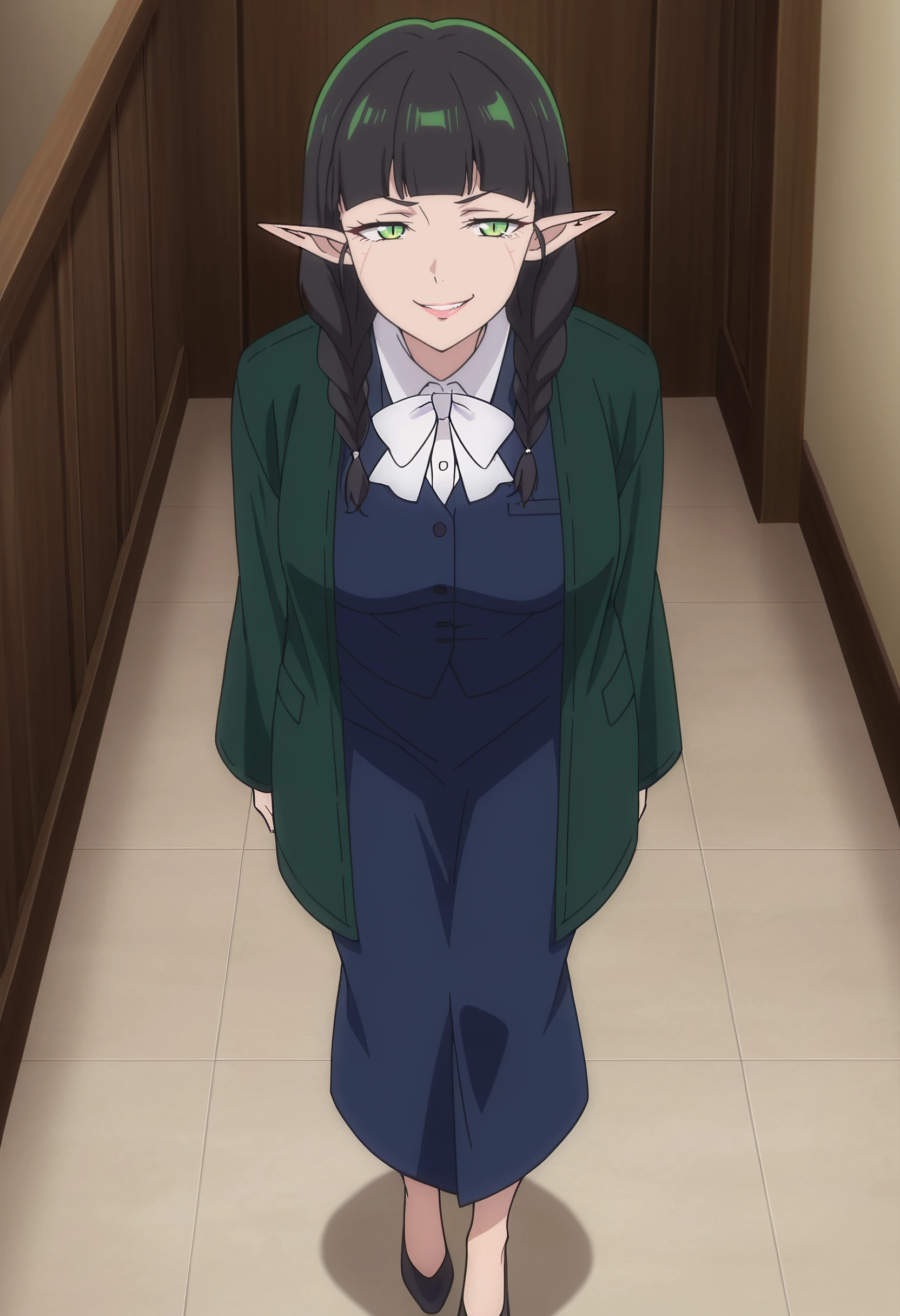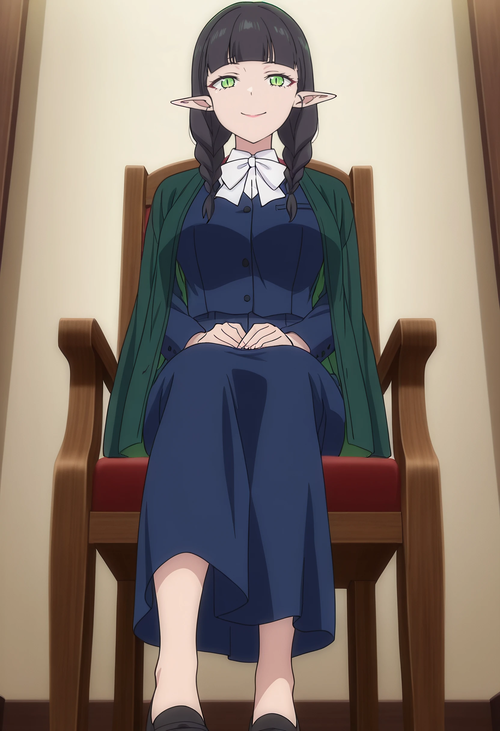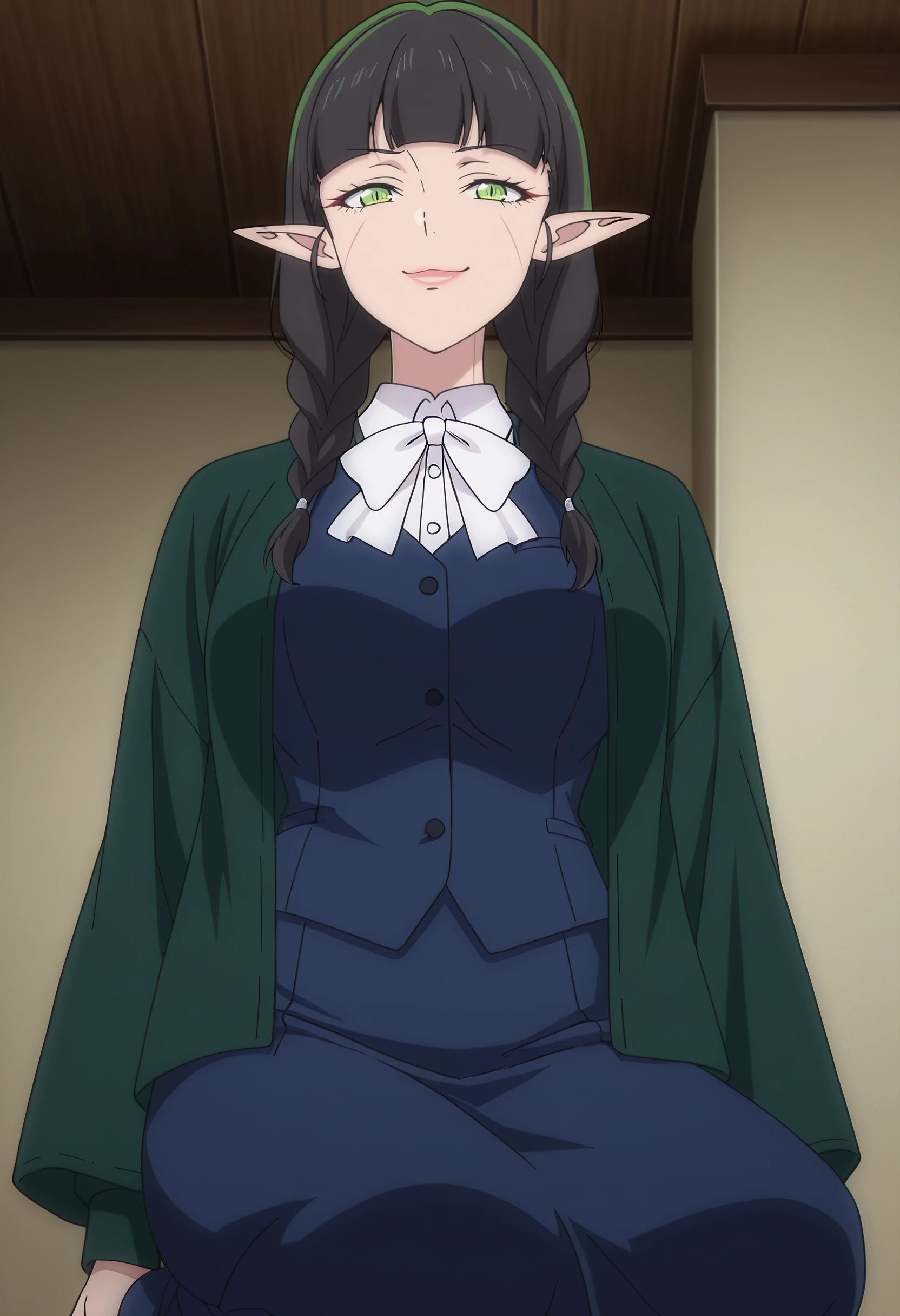 DL2Mag, elf, bangs, black hair, long hair, pointy ears, blunt bangs, braid, green eyes, twin braids, long pointy ears, slit pupils, hair over shoulder,