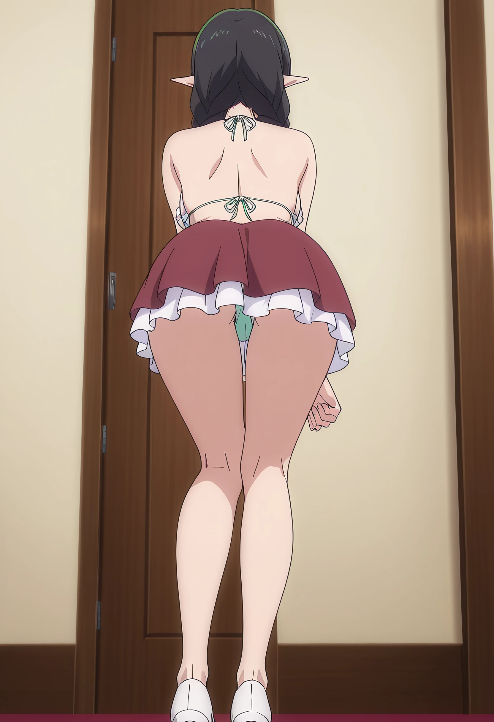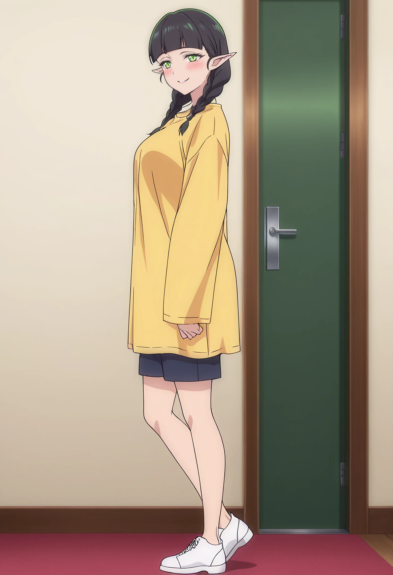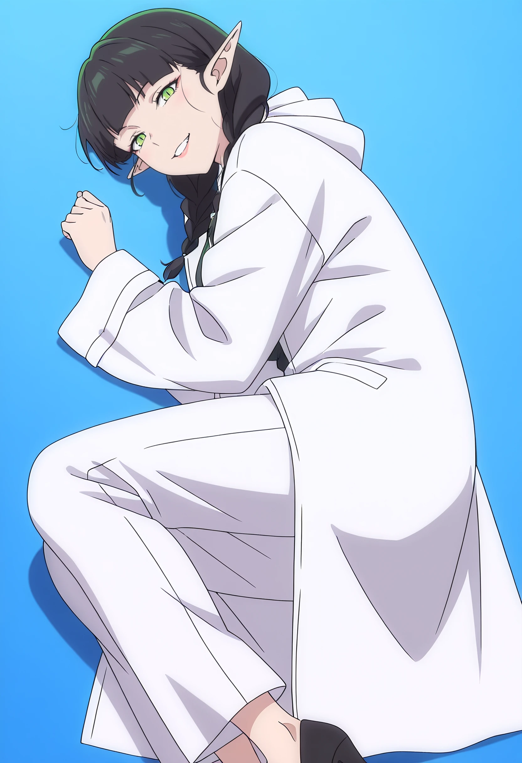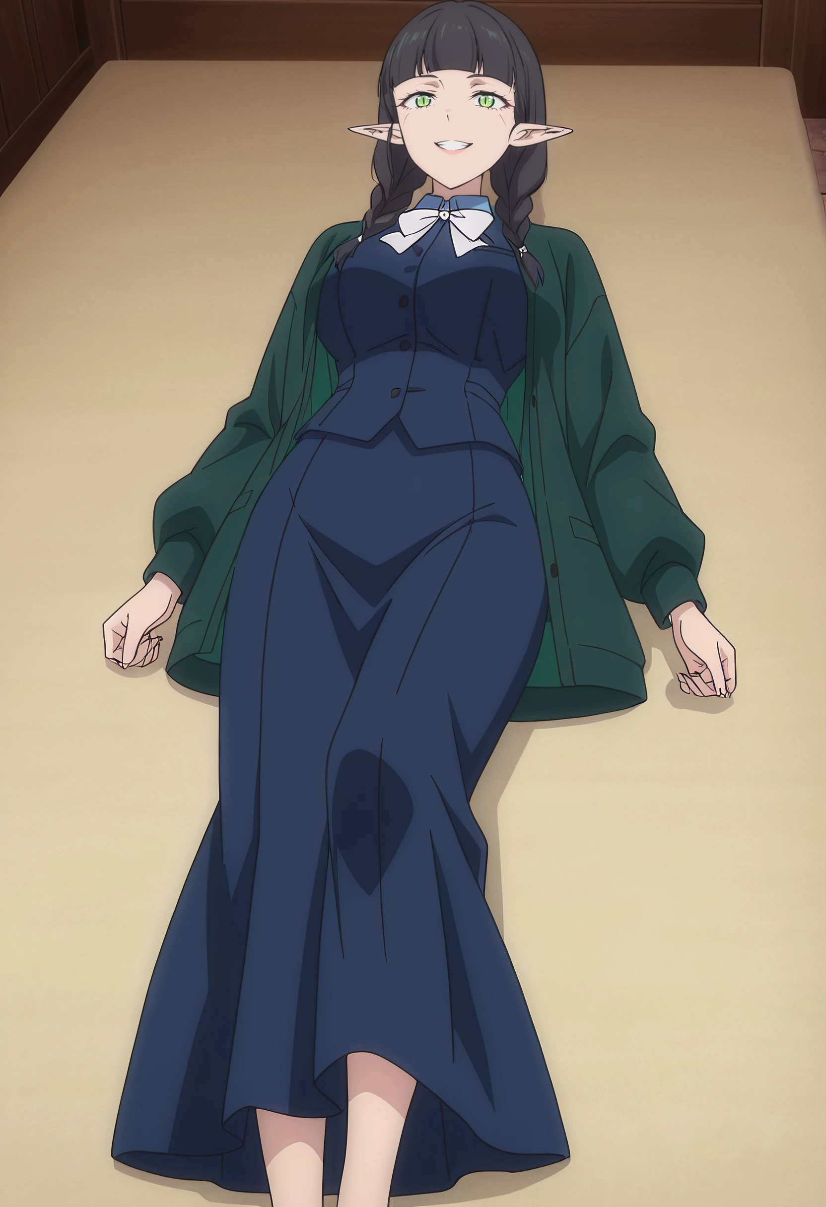 DL2Mag, elf, bangs, black hair, long hair, pointy ears, blunt bangs, braid, green eyes, twin braids, long pointy ears, slit pupils, hair over shoulder,