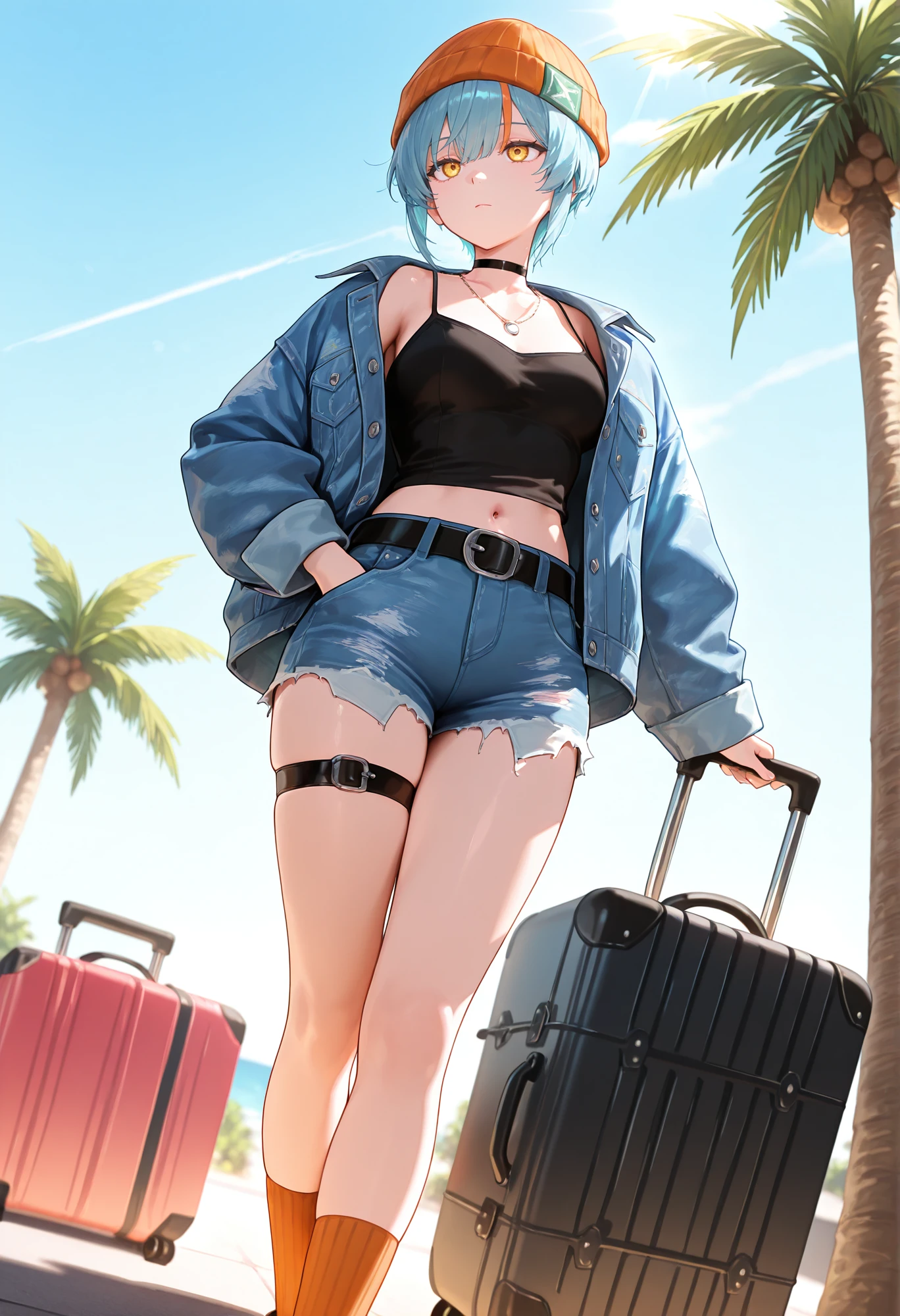 Tropical Getaway: celinetrc, orange beanie, black choker, necklace, denim jacket, oversized clothes, blue jacket, long sleeves, open jacket, black camisole, navel, denim shorts, blue shorts, black belt, thigh strap, orange socks, pink sneakers