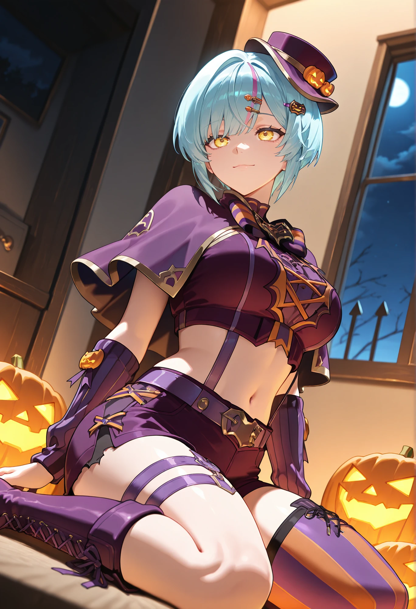 Halloween: celinehwn, purple headwear, tilted headwear, hair ornament, hairclip, purple capelet, bowtie, vertical-striped clothes, crop top, purple shirt, suspenders, navel, purple belt, purple shorts, asymmetrical legwear, single thighhigh, vertical-striped thighhighs, purple nail polish, knee boots, lace-up boots, cross-laced footwear, purple footwear, thigh strap, arm warmers