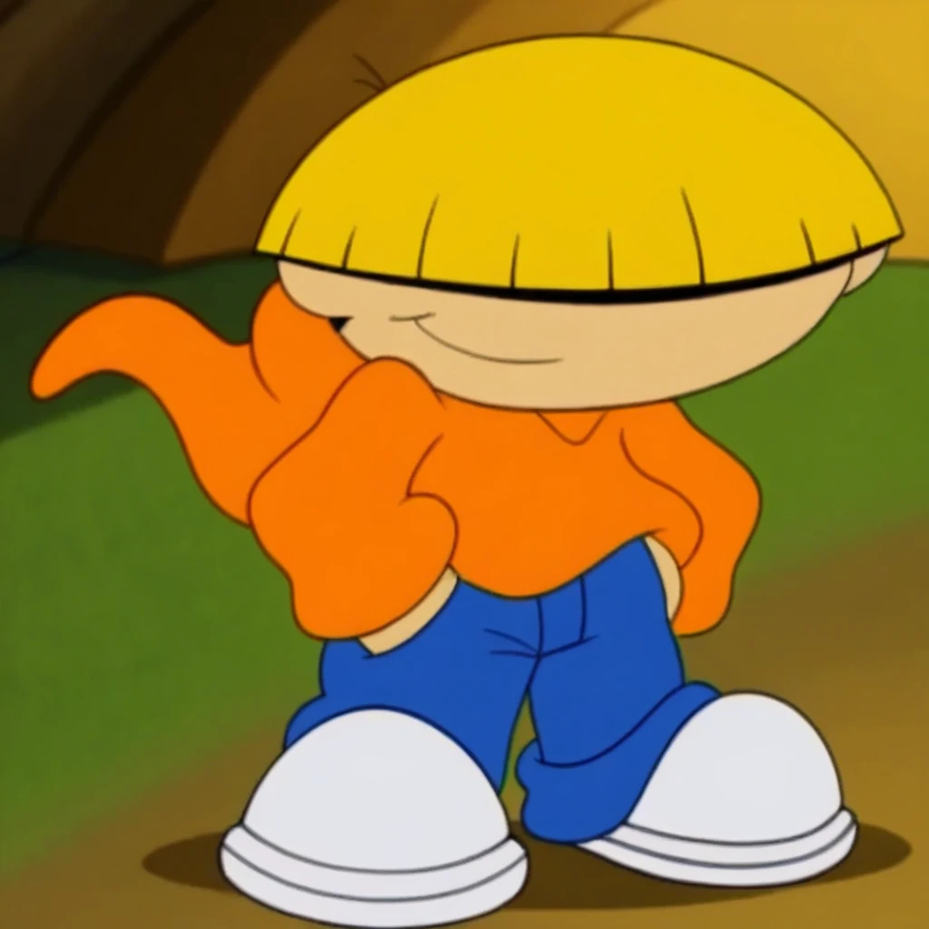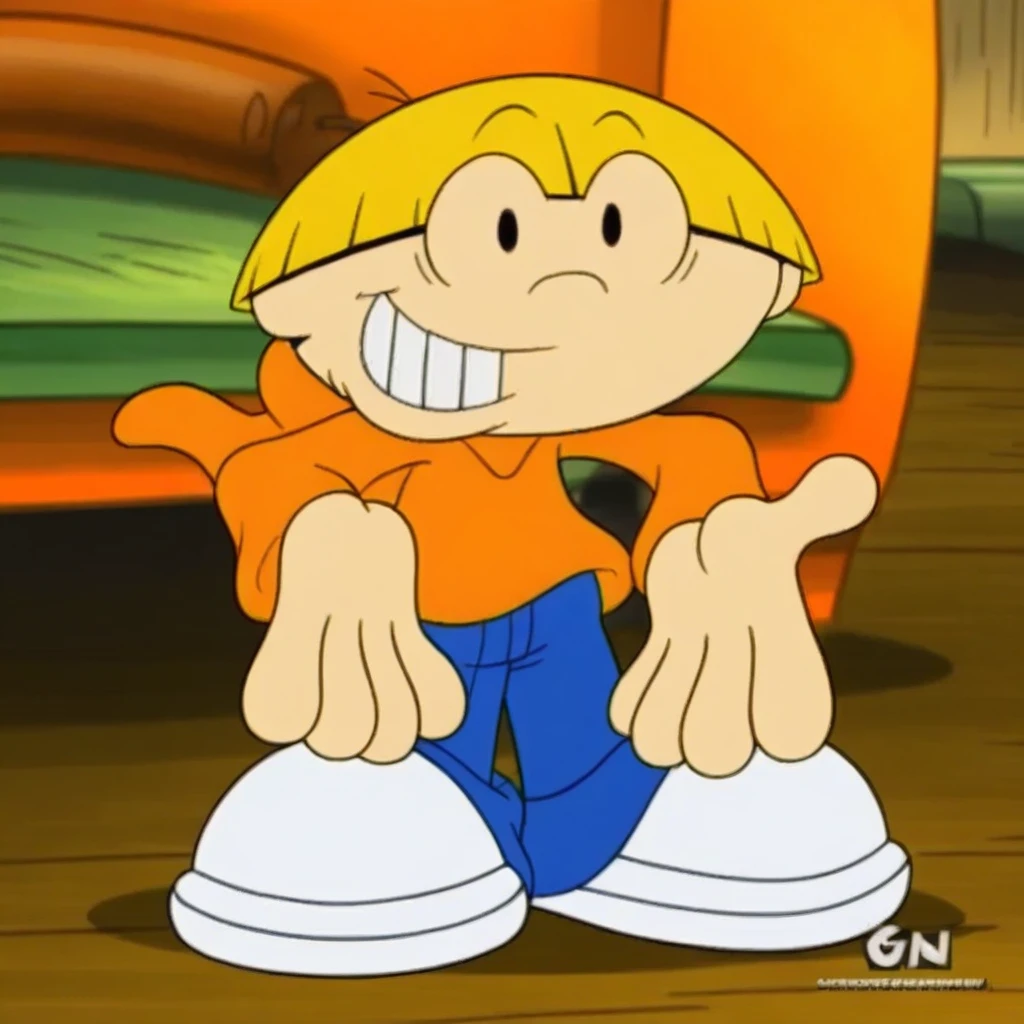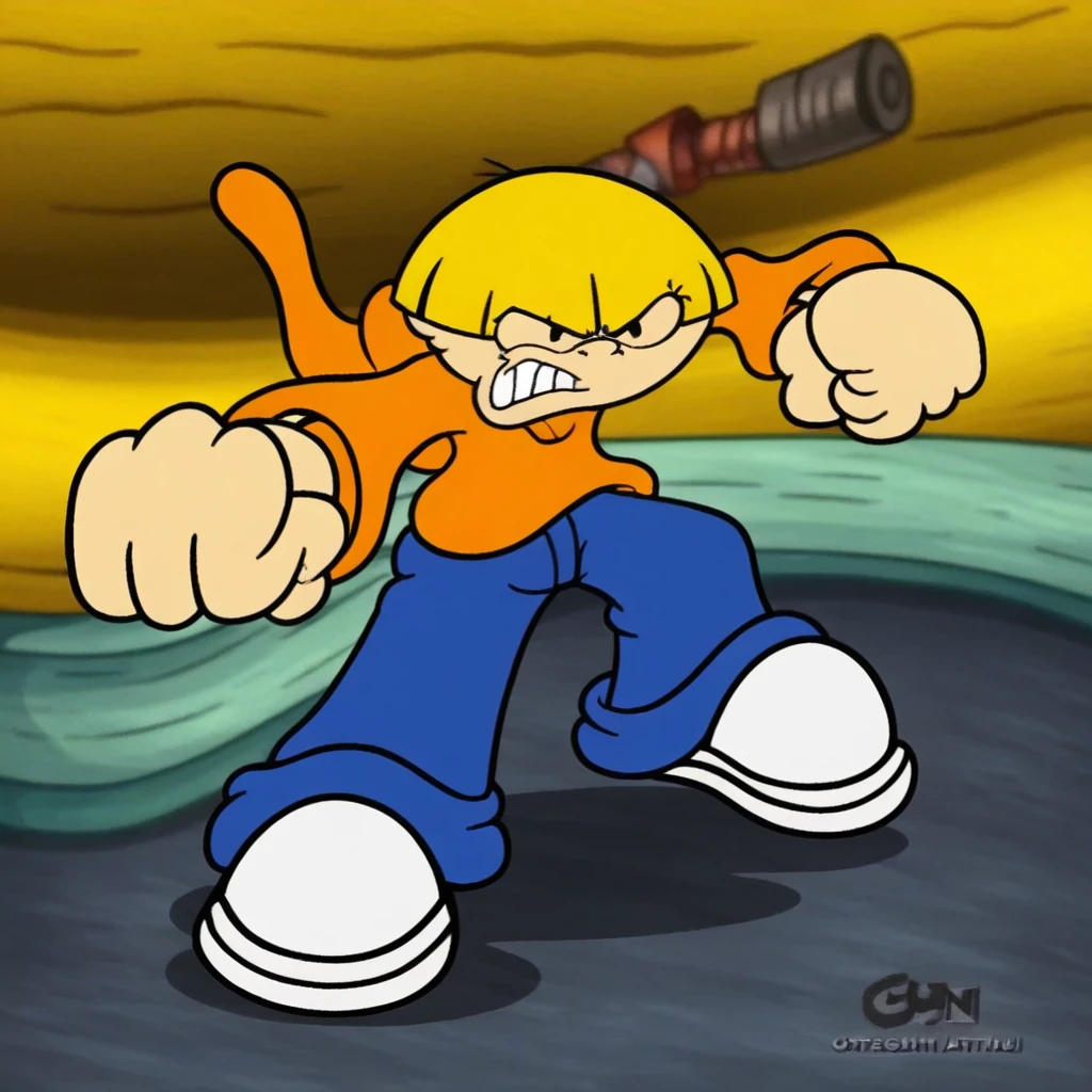 Numbuh4, 1boy, solo, blonde hair, bowl cut, orange hoodie, blue jeans, white shoes