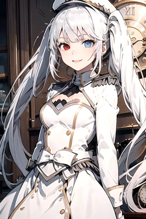 white queen (date a bullet), 1girl, solo, long hair, bangs, long sleeves, hat, twintails, white hair, white gloves, white jacket, white bow, epaulettes, clock eyes, right red eyes, left blue eyes