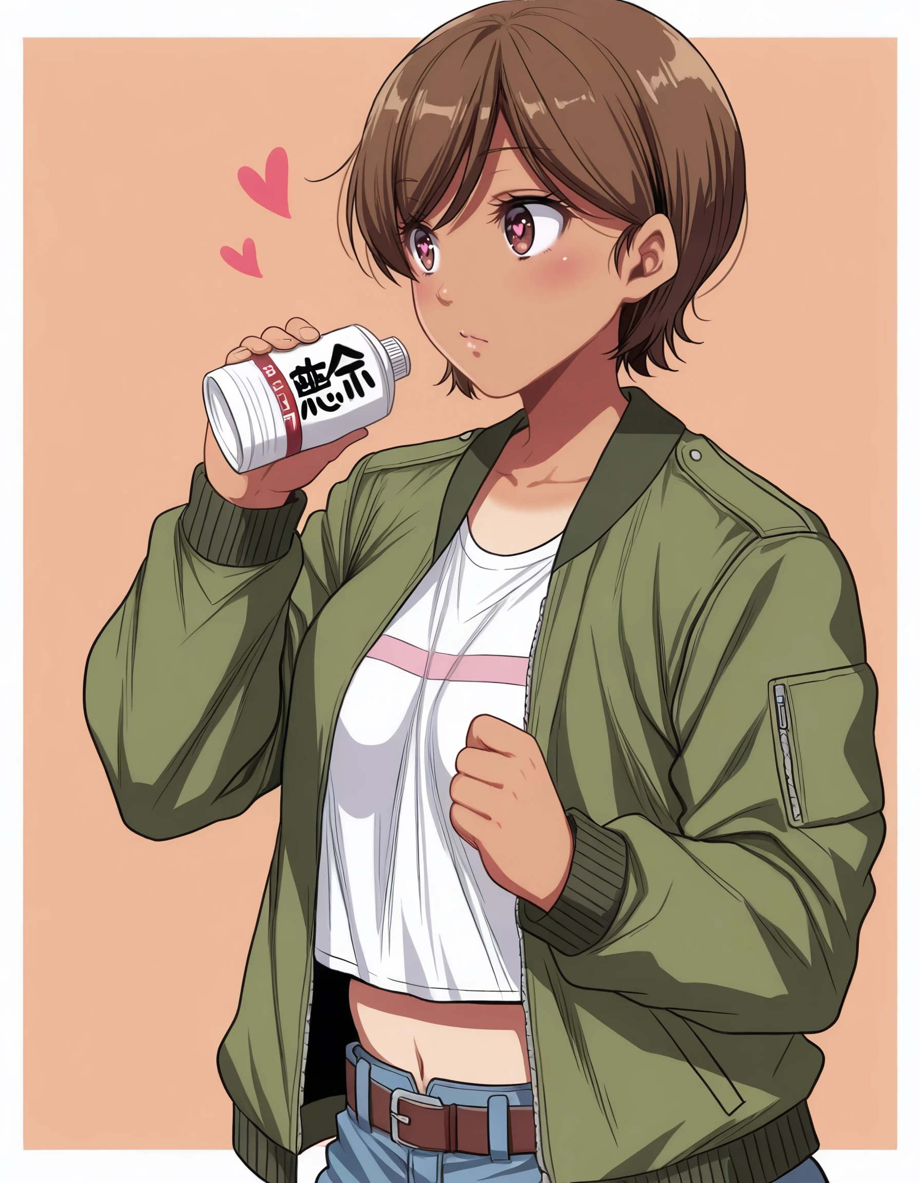 mio_katou, dark-skinned_female, brown_hair, short_hair, brown_eyes, tan, tanlines