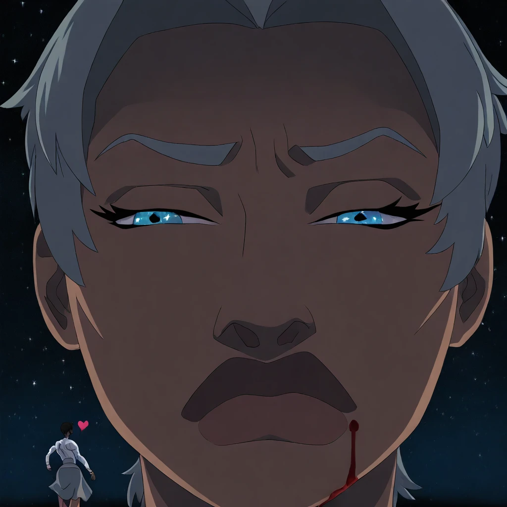 black hair, short hair, parted bangs, blue eyes, muscular female,