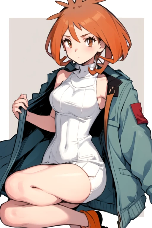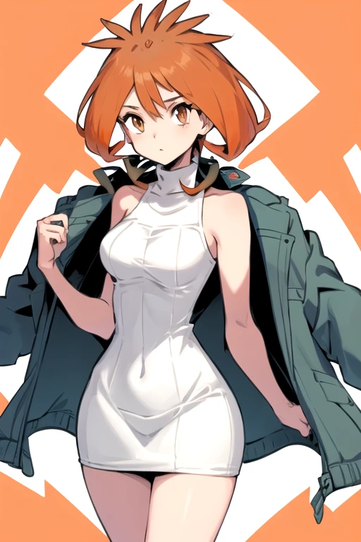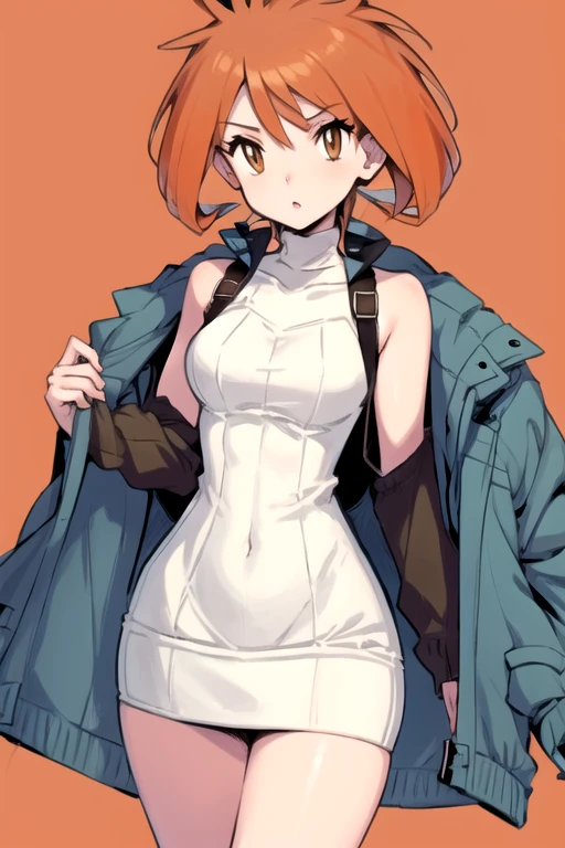 BrigettePokemon, 1girl, solo, short hair, brown hair, brown eyes, open jacket, sleeveless, orange hair, white sweater, turtleneck, short dress, jacket on shoulders, sweater dress,