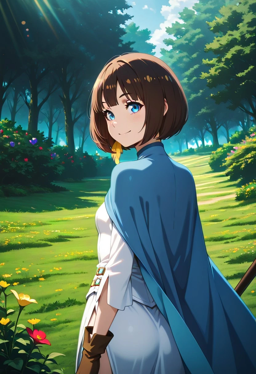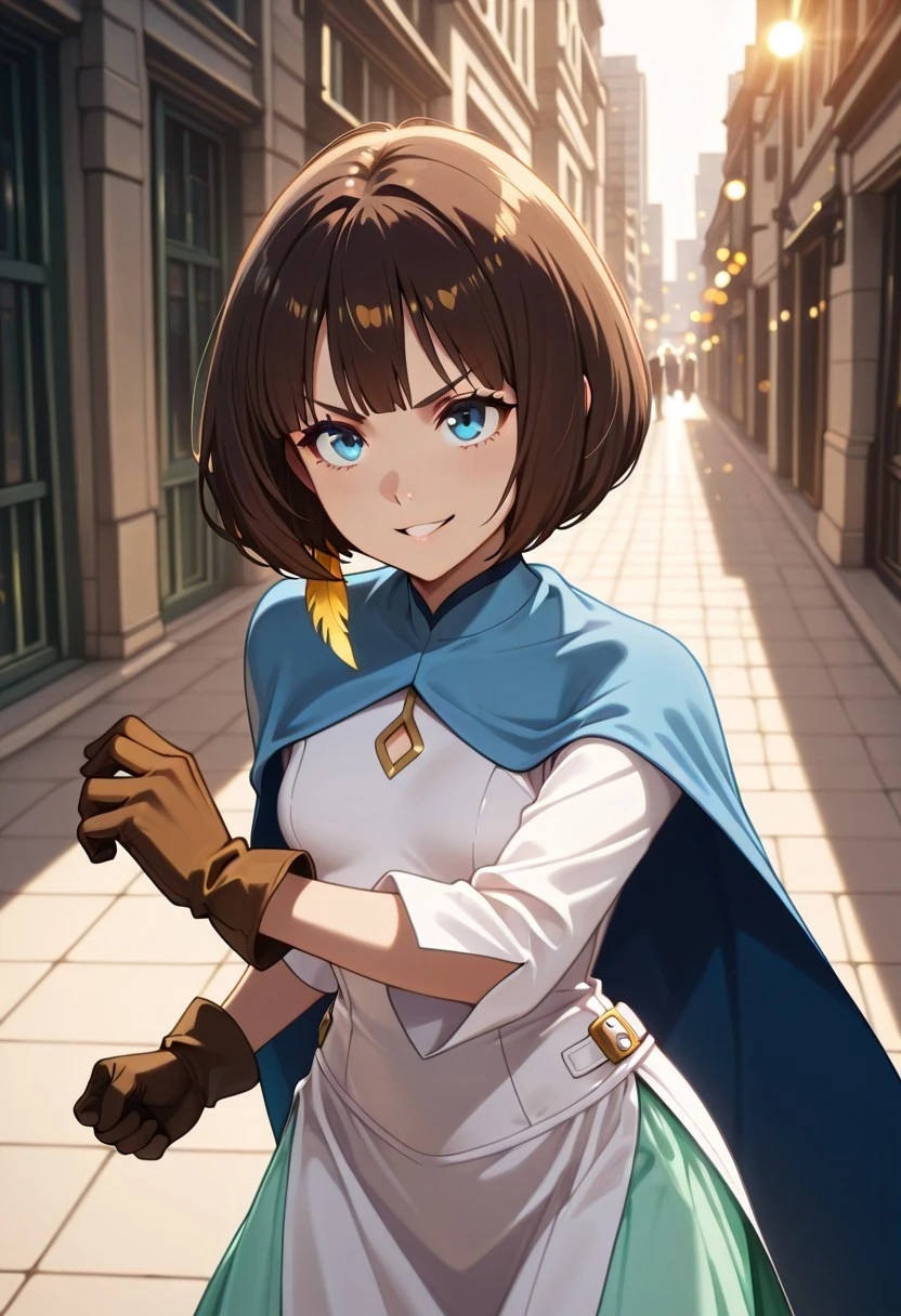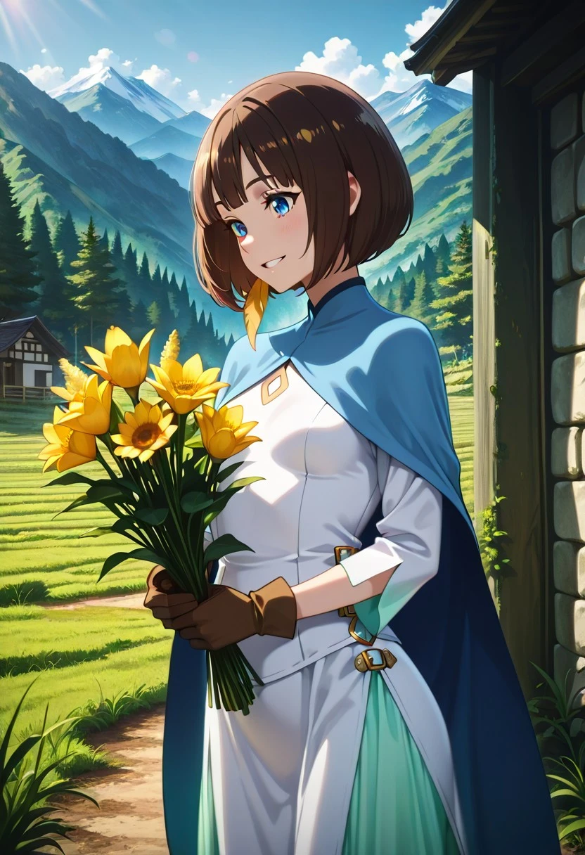 Character's basic outfit: blue cape, white dress, long dress, buckles on the sides, long sleeves, side slit, green petticoat, brown gloves, brown footwear
