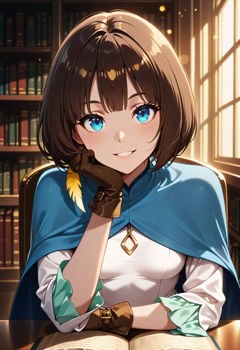 Character appearance: brown hair, short hair, bangs, bob cut, blue eyes, hair ornament, feather in the hair, yellow feather, small breasts