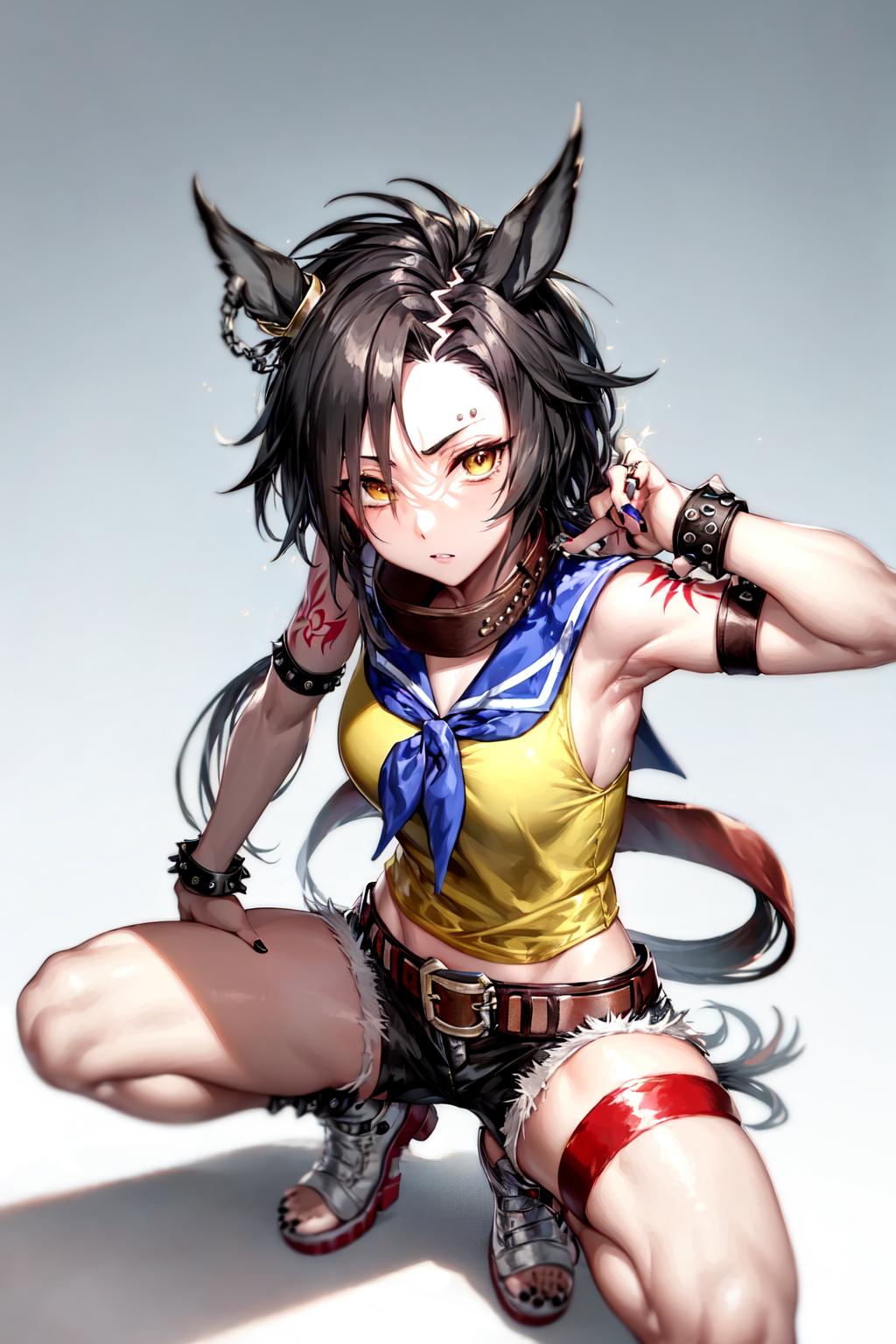 hair ornament, arm tattoo, arm belt, ring, blue sailor collar, blue neckerchief, yellow shirt, sleeveless shirt, bare shoulders, spiked bracelet, studded bracelet, midriff, belt, nail polish, white shorts, short shorts, cutoffs, thigh strap, white footwear
