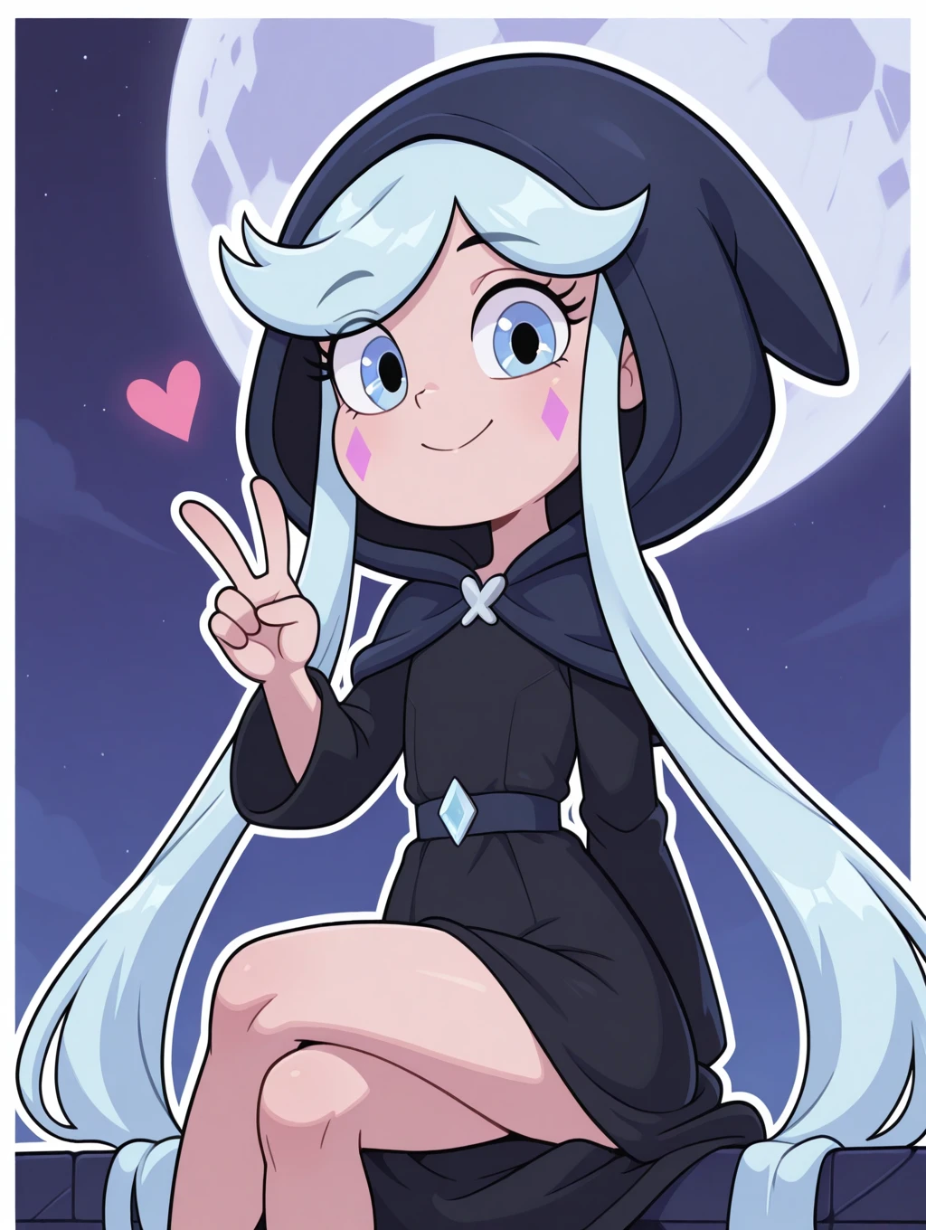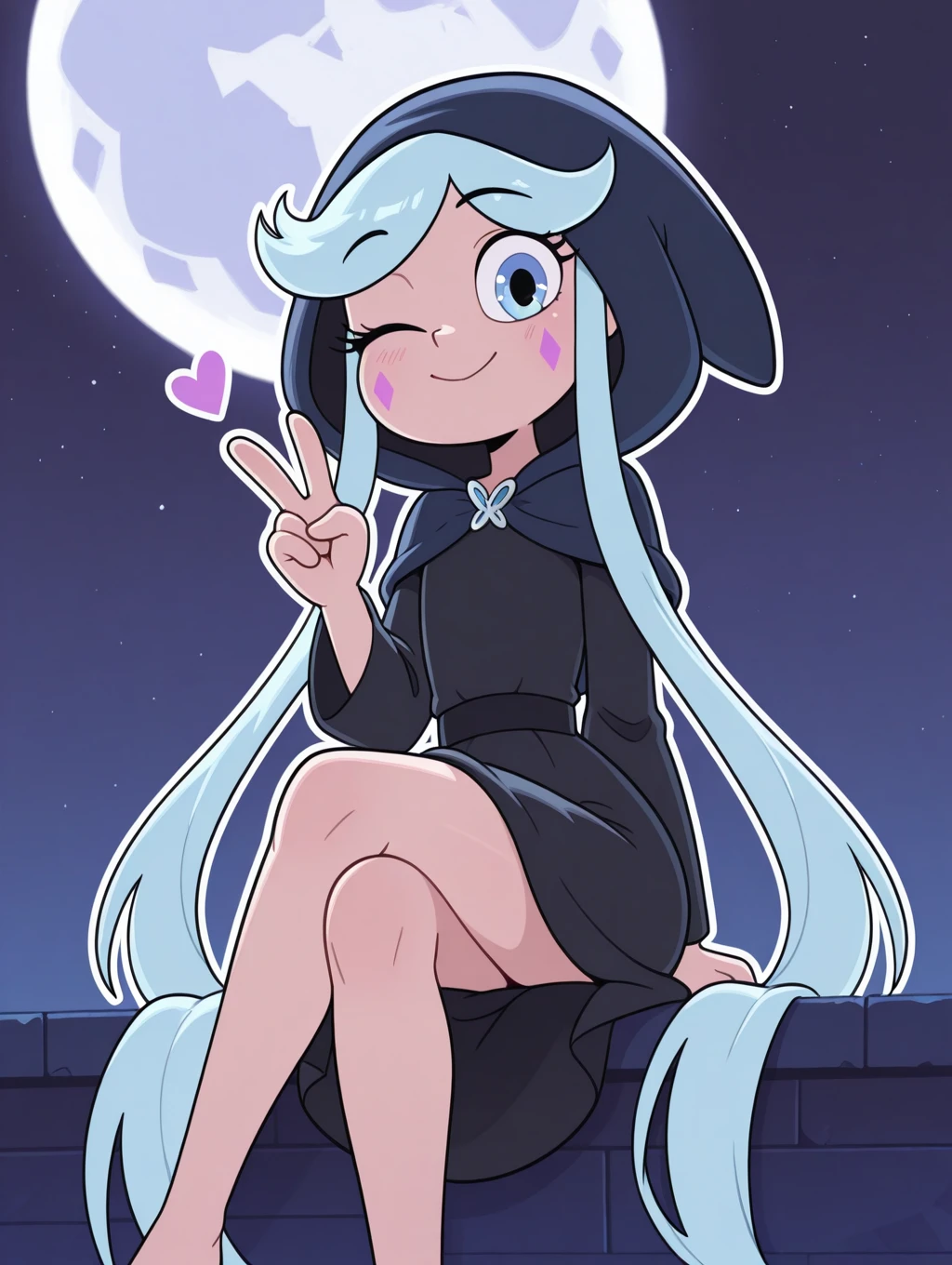 SVTFOE_MoonButterfly, 1girl, solo, Small body, shortstack, looking_at_viewer, blue eyes,happy, long hair, blue hair, very long hair, sky, black dress, facial mark, dress, hood,Description