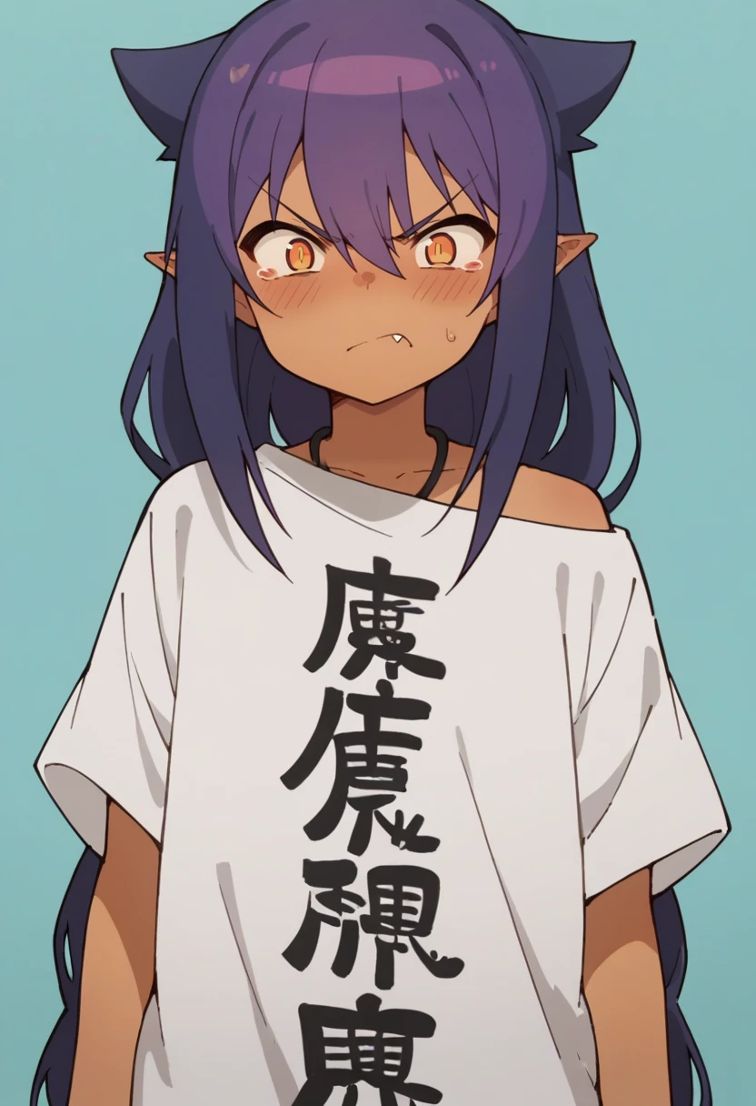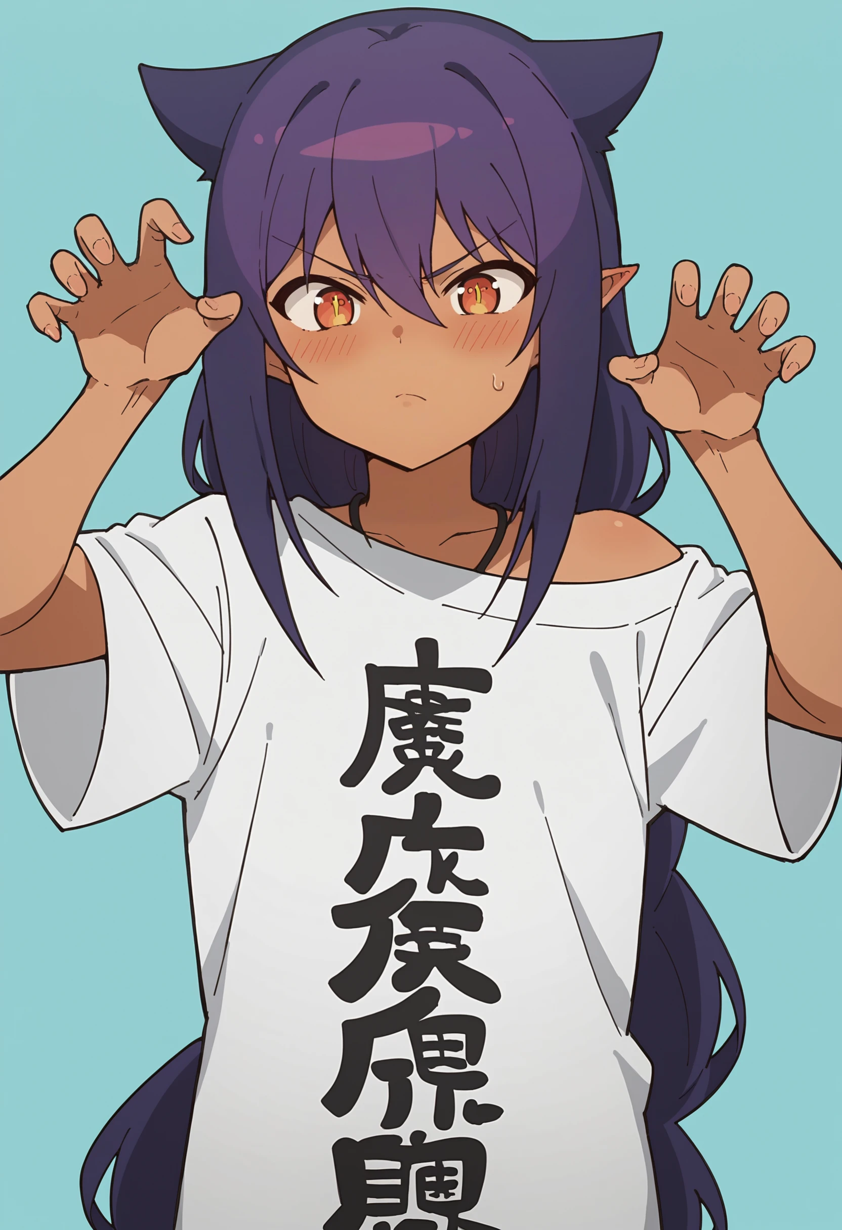 1girl, dark skin, dark-skinned female, long hair, hair between eyes, purple hair, pointy ears