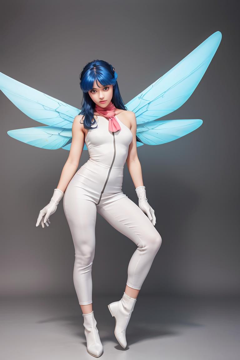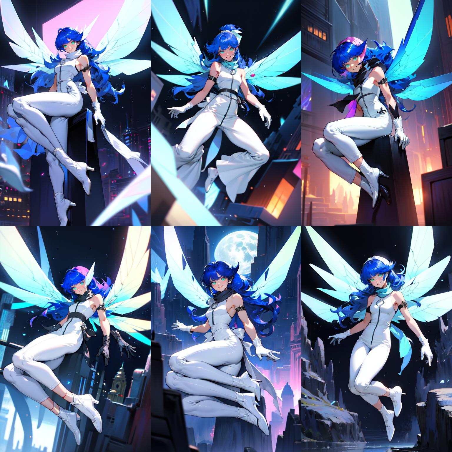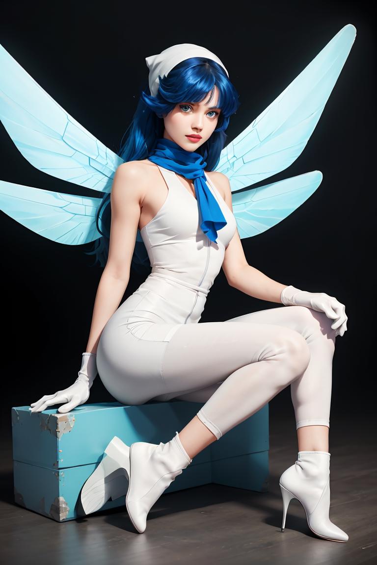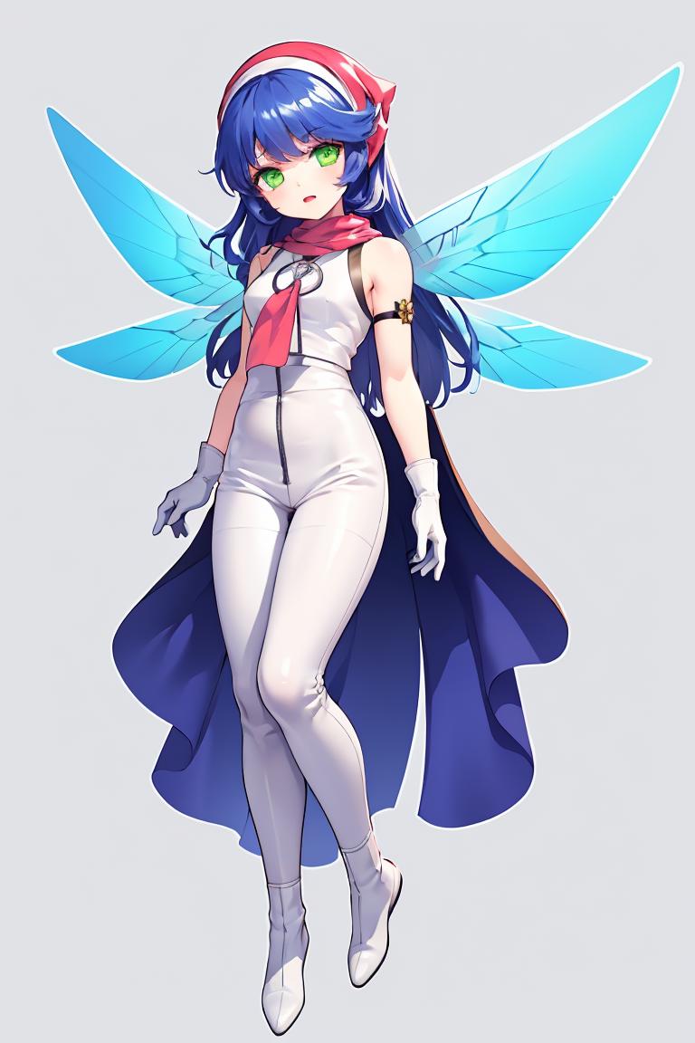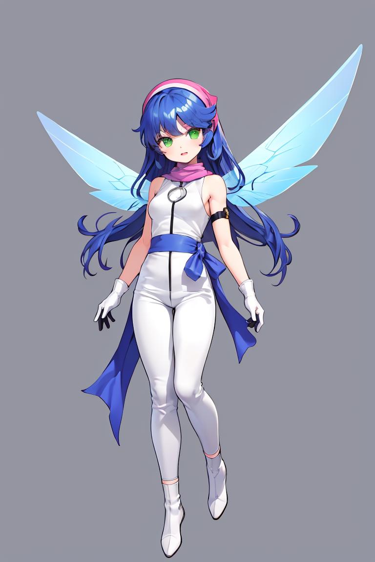 Tags: pixieds, blue hair, wings, gloves, green eyes, fairy, long hair, scarf, dress, white pants, white footwear