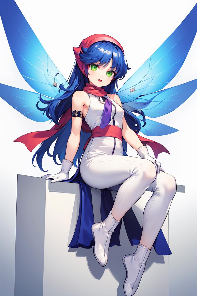 pixieds, blue hair, wings, gloves, green eyes, fairy, long hair, scarf, dress, white pants, white footwear