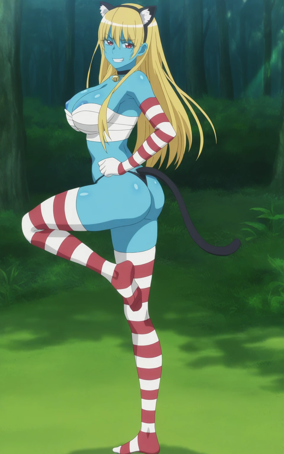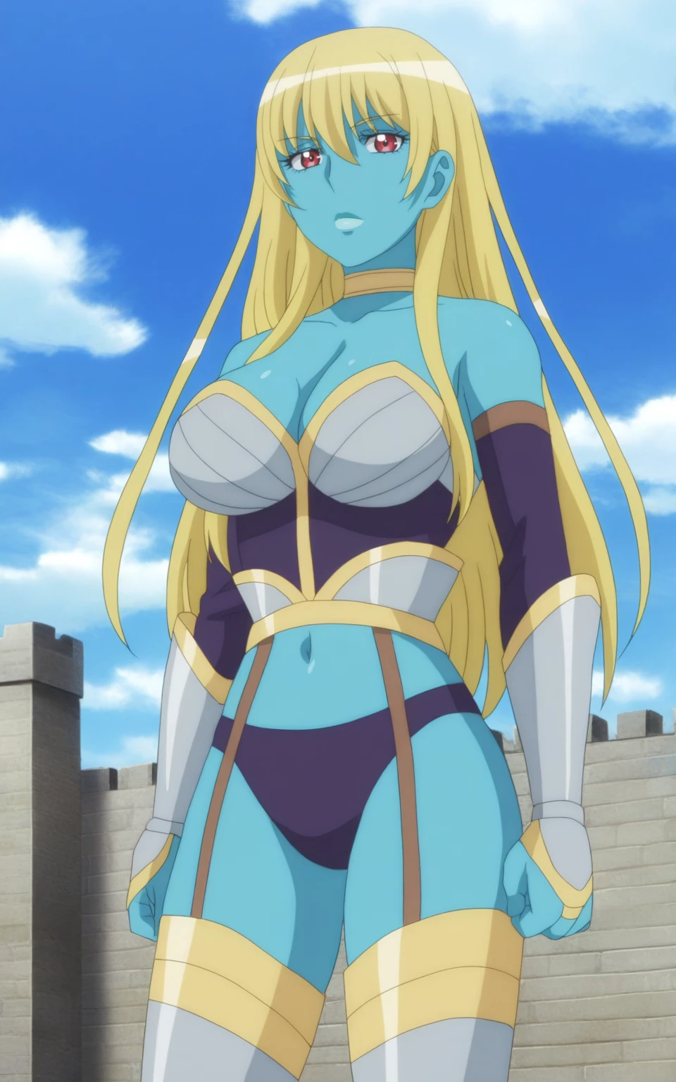 ronailtsu, long hair, blonde hair, red eyes, large breasts, blue skin