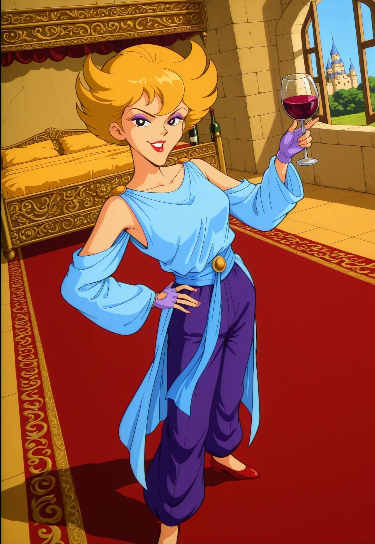 Labella, 1girl, solo, blonde hair, flipped hair, eyeshadow, black eyes, red lipstick, blue dress, detached sleeves, purple fingerless gloves, purple pants, red footwear