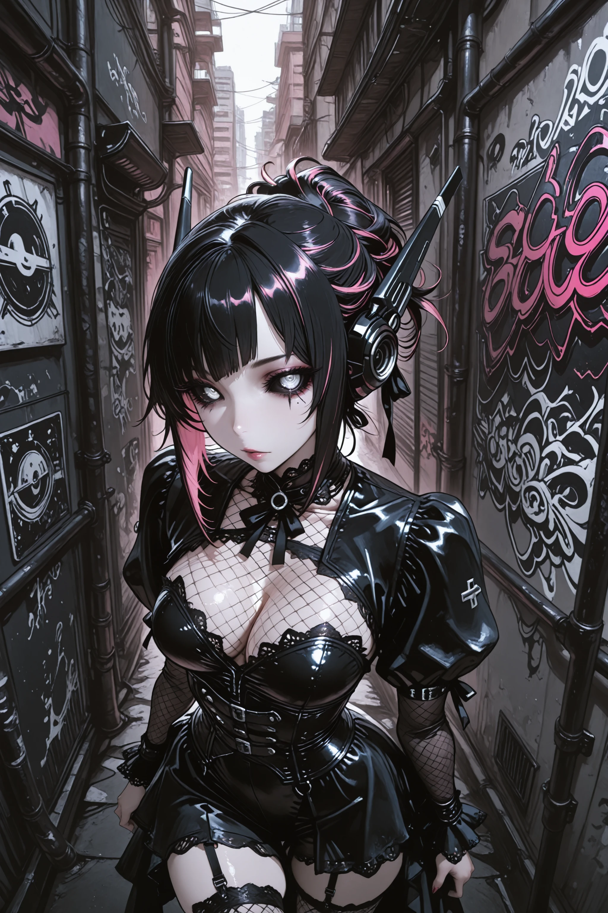 you will probably get black and pink hair, braided buns, diagonal bangs, white eyes and black sclera (though eye detailer might mess with that if it's not prompted, at least based on my testing)