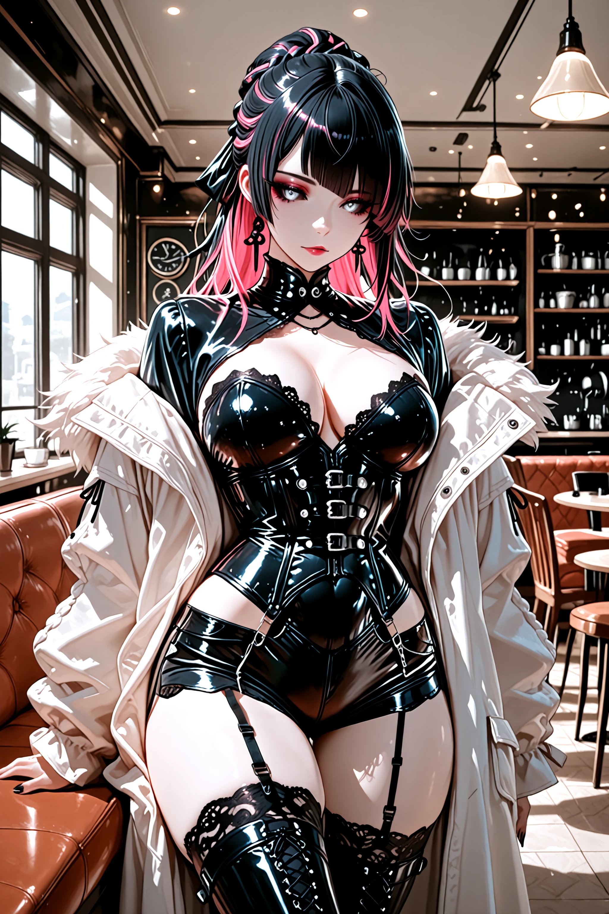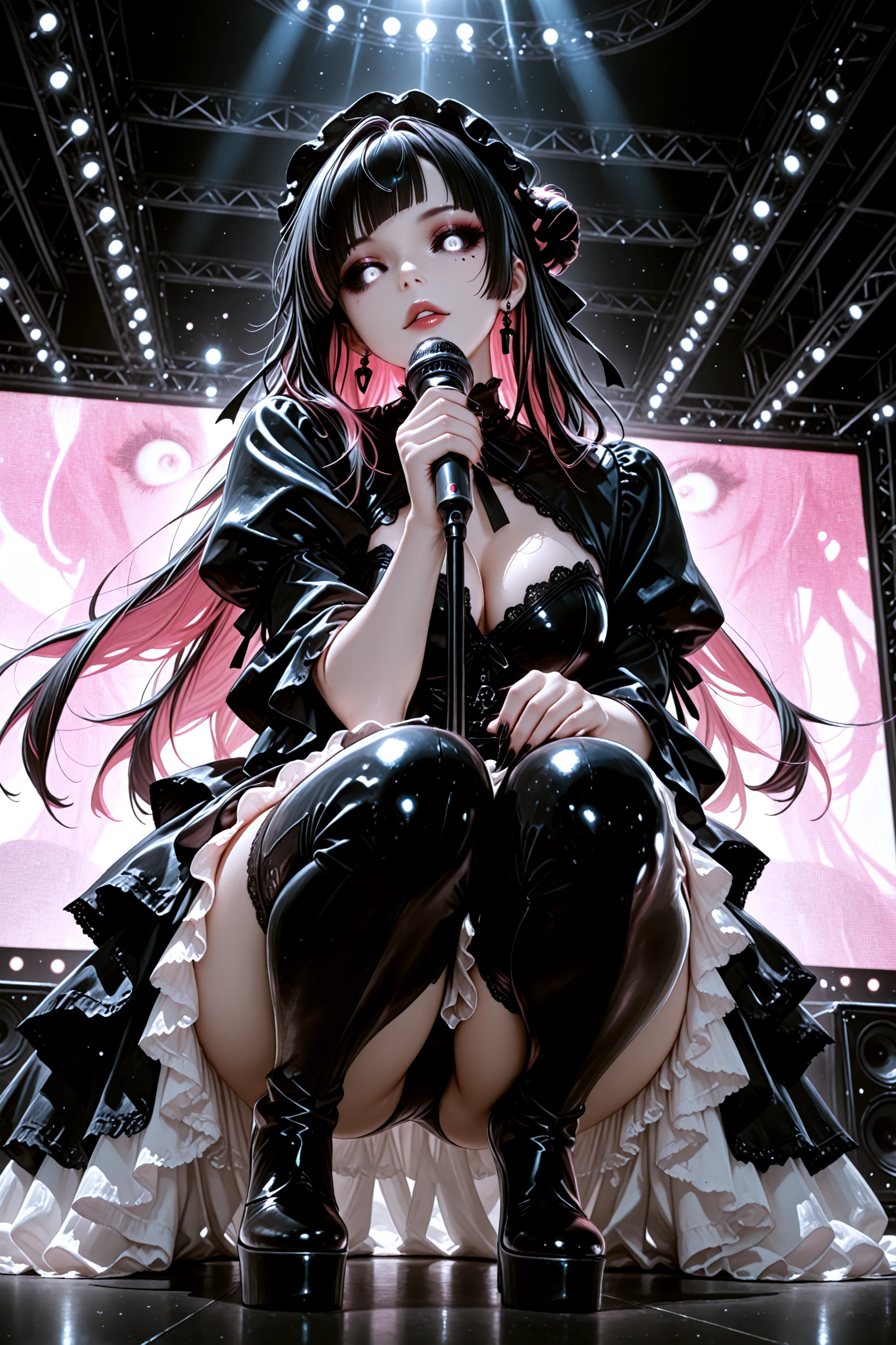 you will get black and white shiny clothes with lace and puffy sleeves. dresses and skirts tend to be showgirl unless prompted otherwise. shrug appears pretty consistently