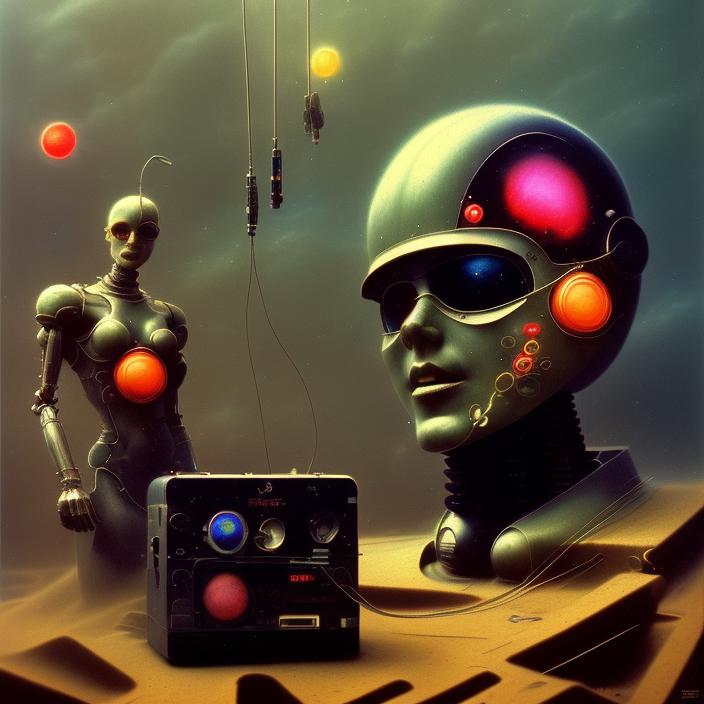 "A retrofuturistic scene of an arcade wired mess on synthesizer, mechanical delay, wiring components, ultrago austin metal wiring, iris van Buren, Karol Bak, Kiichi Obituary by Beksinski, david falls fanart robot machine"